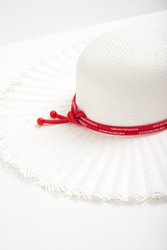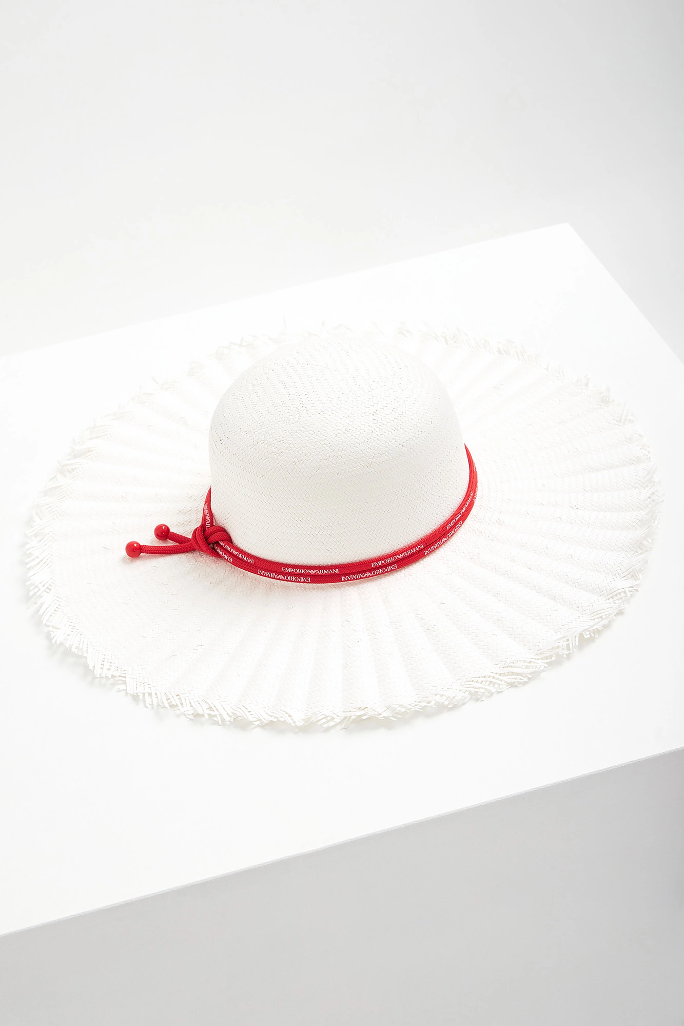 Kapelusz marki Emporio Armani w białym kolorze. U góry ozdobny, sygnowany sznurek w czerwonym kolorze. Całość pleciona. Rondo wykończone ozdobnym strzępieniem. Sygnowana wyściółka.