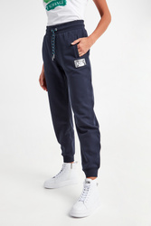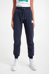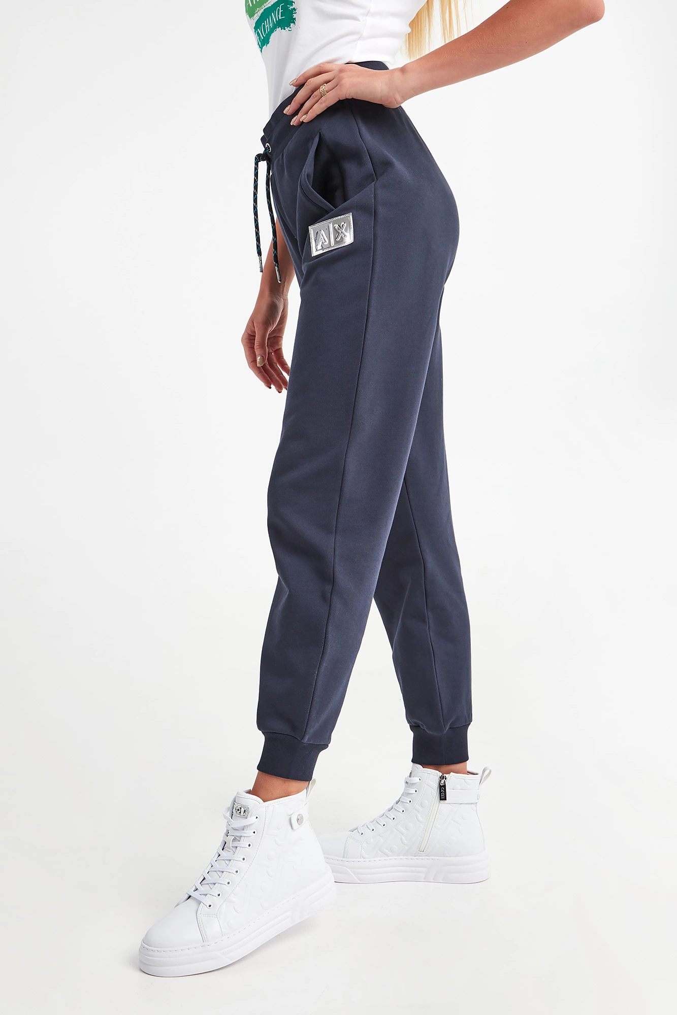 Spodnie dresowe marki Armani Exchange w granatowym kolorze. Fason regular fit. W pasie ściągacz regulowany za pomocą kolorowych troczków. Z boku srebrna, połyskująca naszywka z tłoczonym logo marki. Dwie boczne, wpuszczane kieszenie. Nogawki zakończone ściągaczami. Wykonane z czystej bawełny.