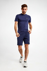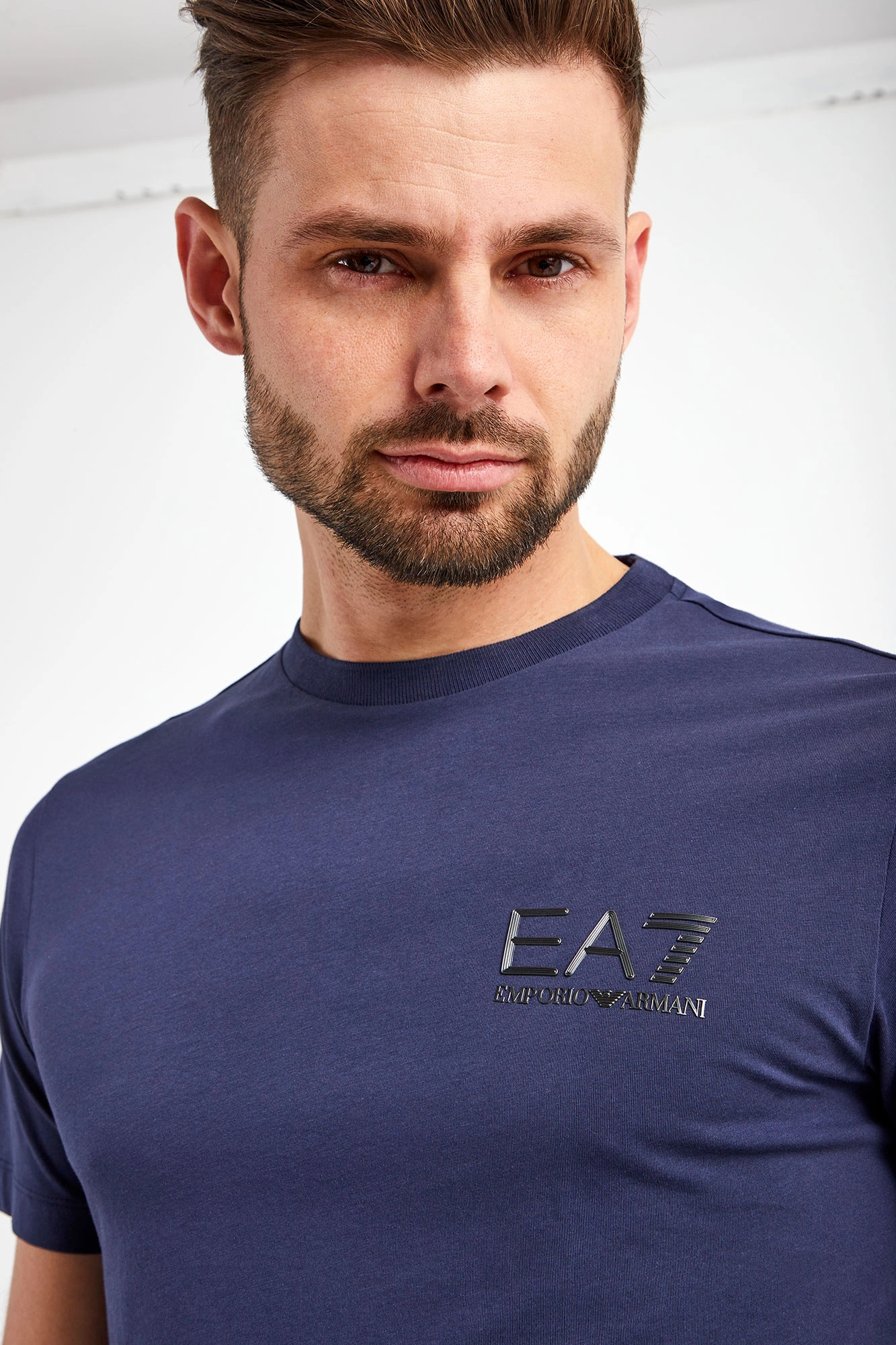 T-shirt marki EA7 Emporio Armani w granatowym kolorze. Fason typu regular fit. Z przodu gumowany nadruk z logo i nazwa marki. Dekolt typu o-neck wykończony elastycznym ściągaczem. Krótkie rękawy i dół wykończony przeszyciem. Wykonany z czystej bawełny.