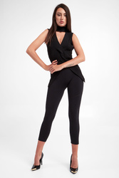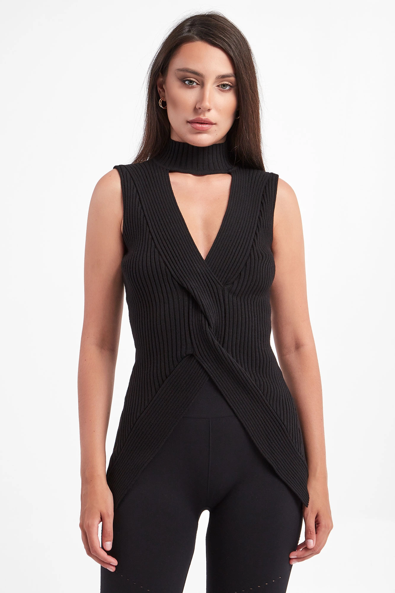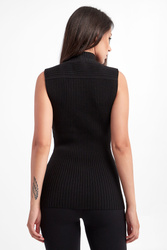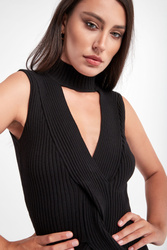 Top marki Wolford w czarnym kolorze. Fason typu slim fit. Na całości struktura w postaci prążków tworzących zachwycający efekt warkocza. Dekolt v-neck, ze stójką. W większości wykonany z wełny dziewiczej co sprawia, że top jest niezwykle miękki.