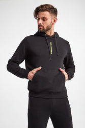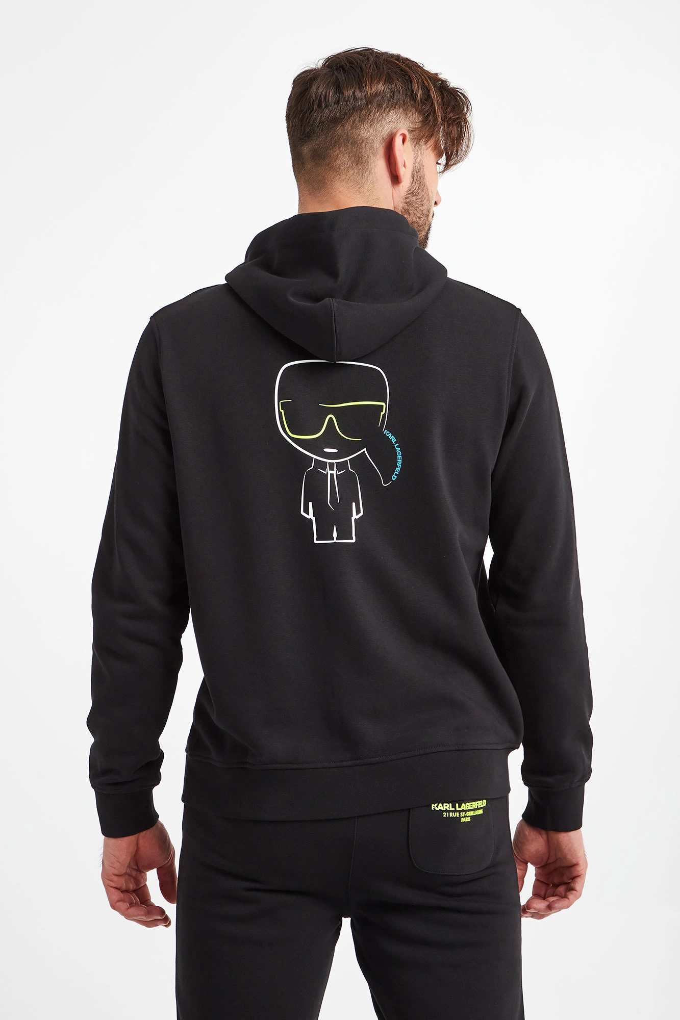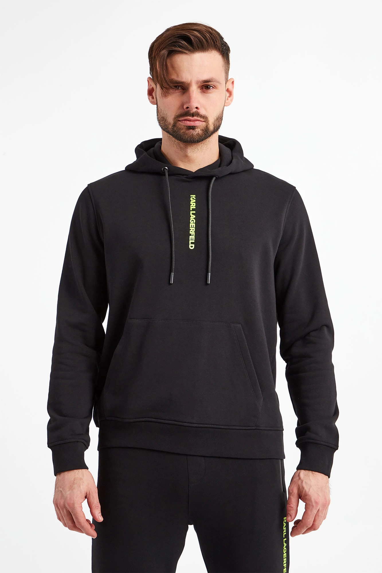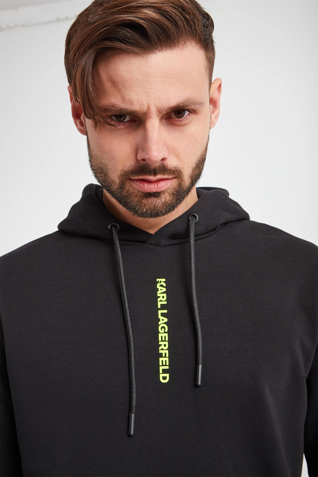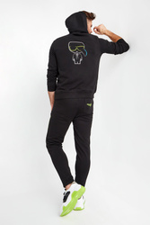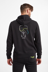 Bluza marki Karl Lagerfeld w czarnym kolorze, pochodząca z linii "Karl Cares", która wykorzystuje organiczne tkaniny, by wspierać zrównoważoną modę. Fason typu regular fit. Z kapturem regulowanym za pomocą troczków. Z przodu duża kieszeń typu kangurek i gumowany nadruk postaci nazwy marki w neonowym, żółtym kolorze. Z tyłu duży, wielokolorowy nadruk w postaci wizerunku założyciela marki. Długie rękawy i dół wykończone elastycznym ściągaczem. Wykonana z elastycznej bawełny.