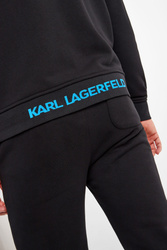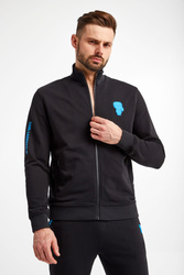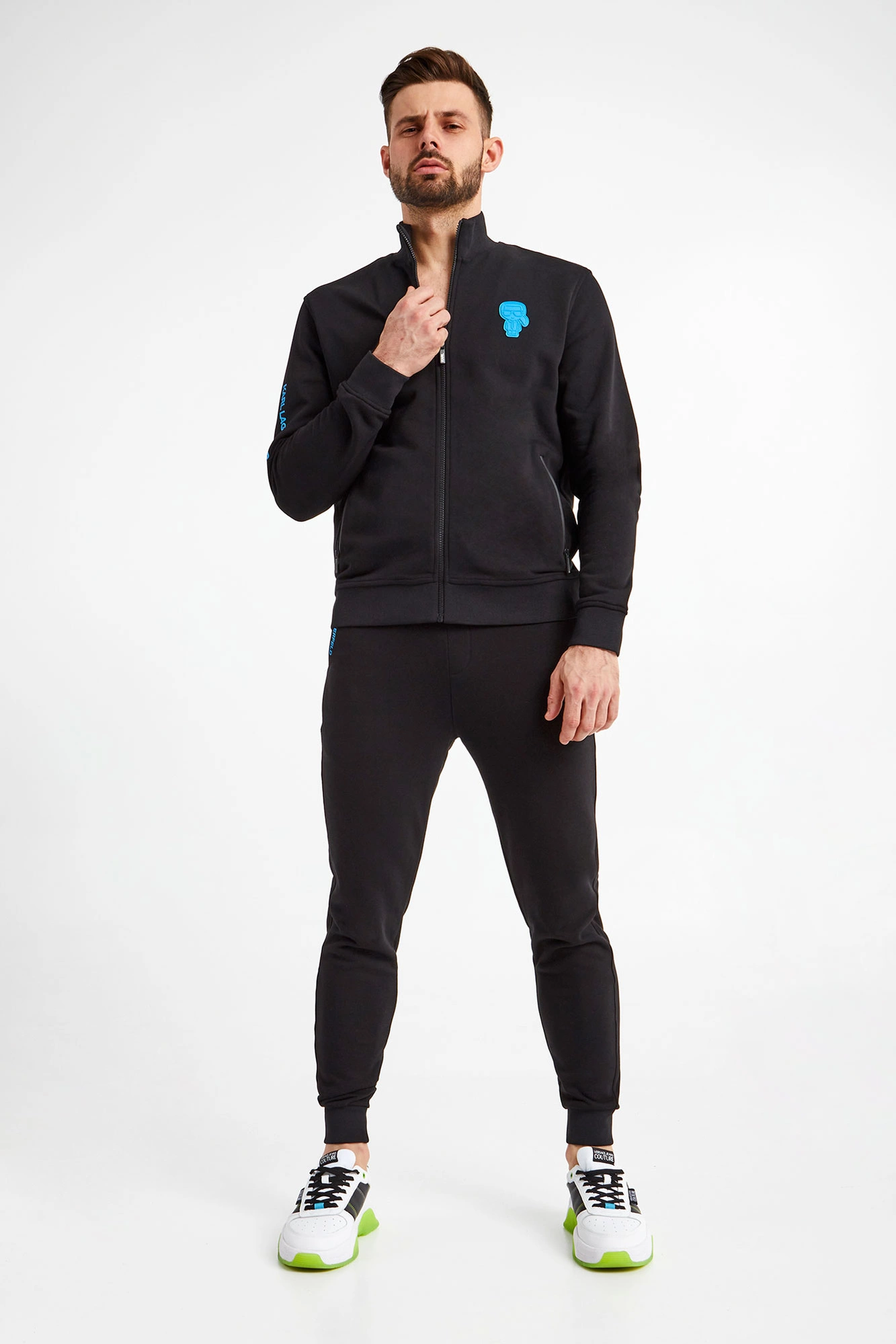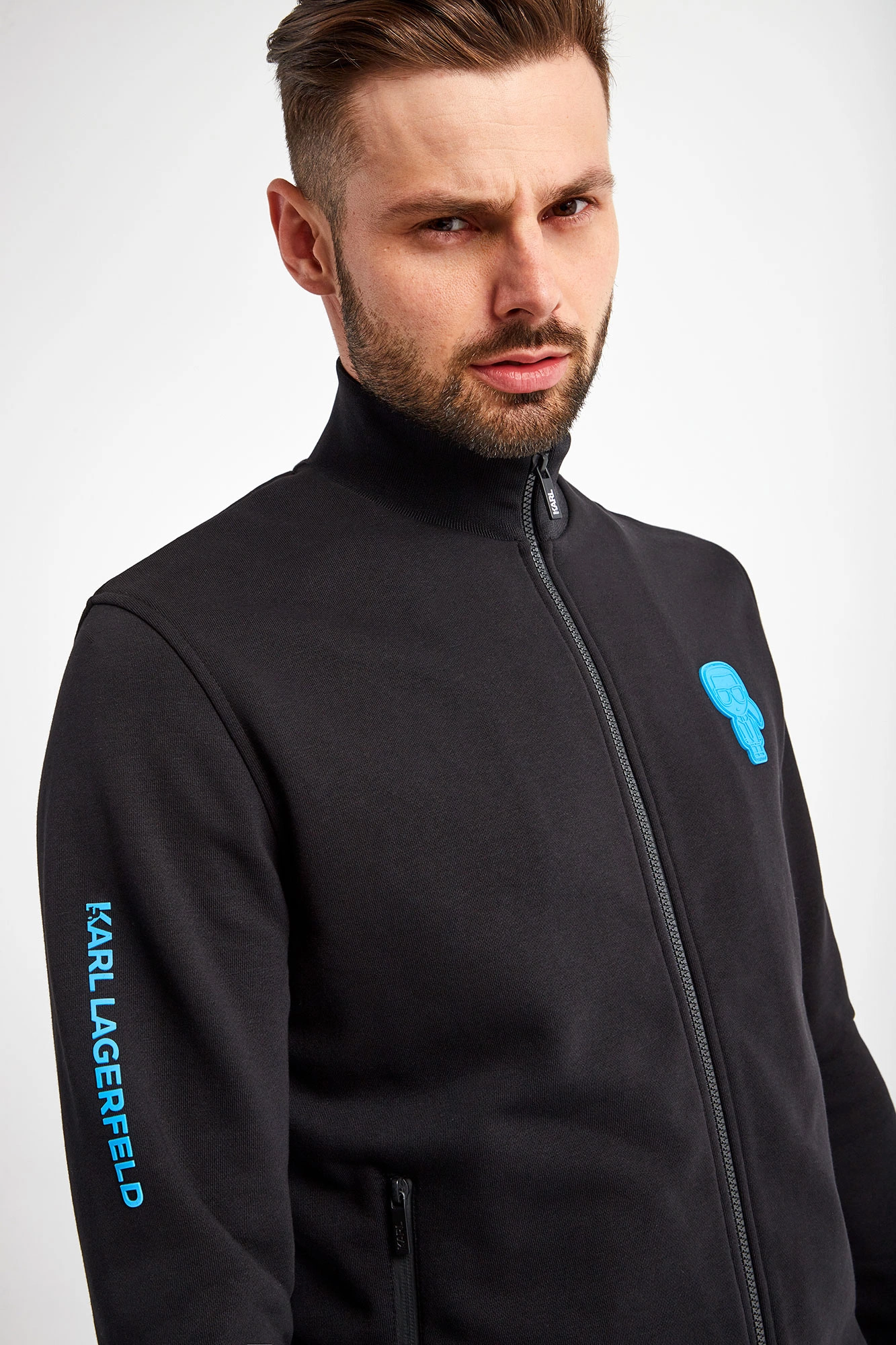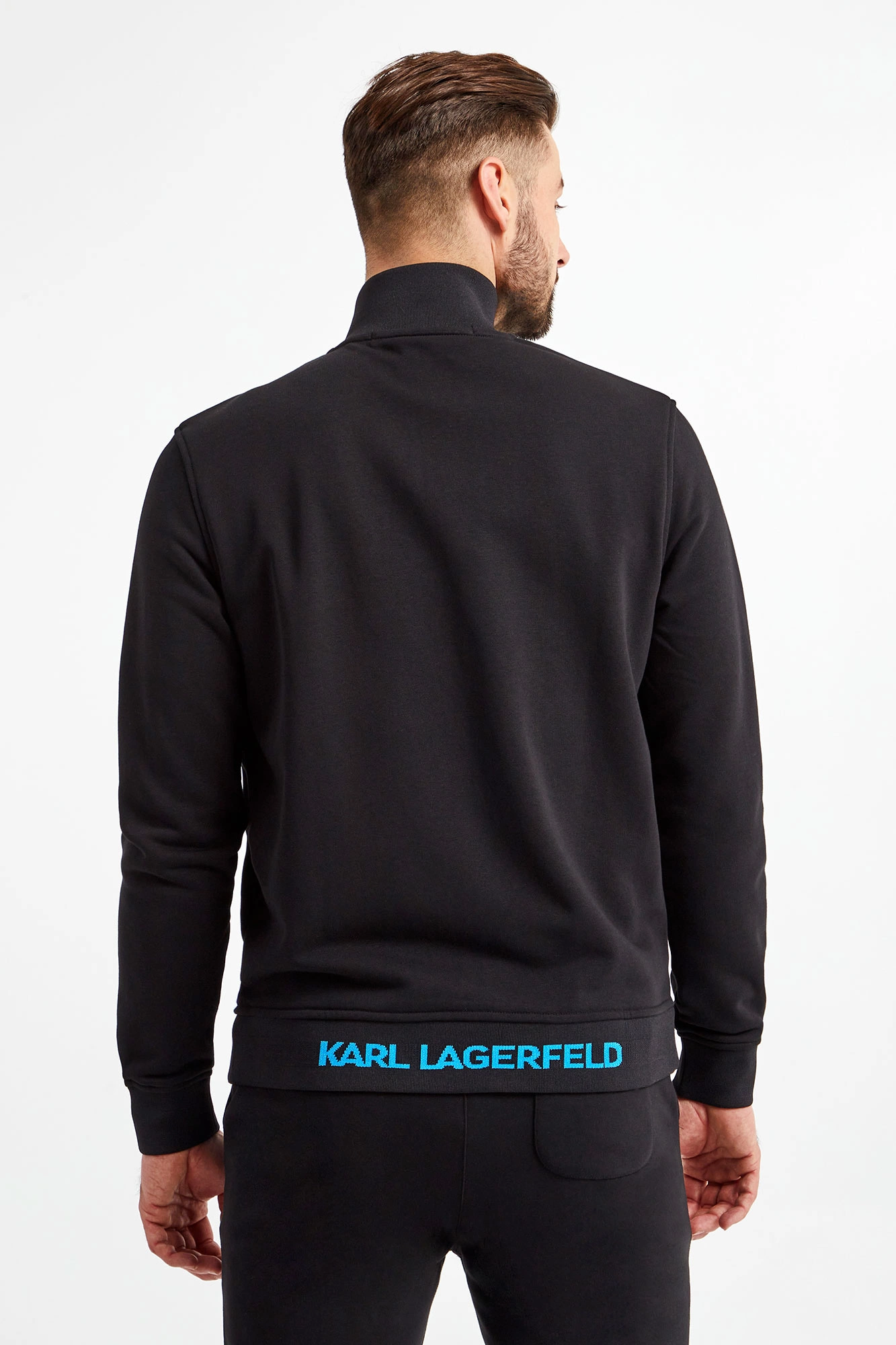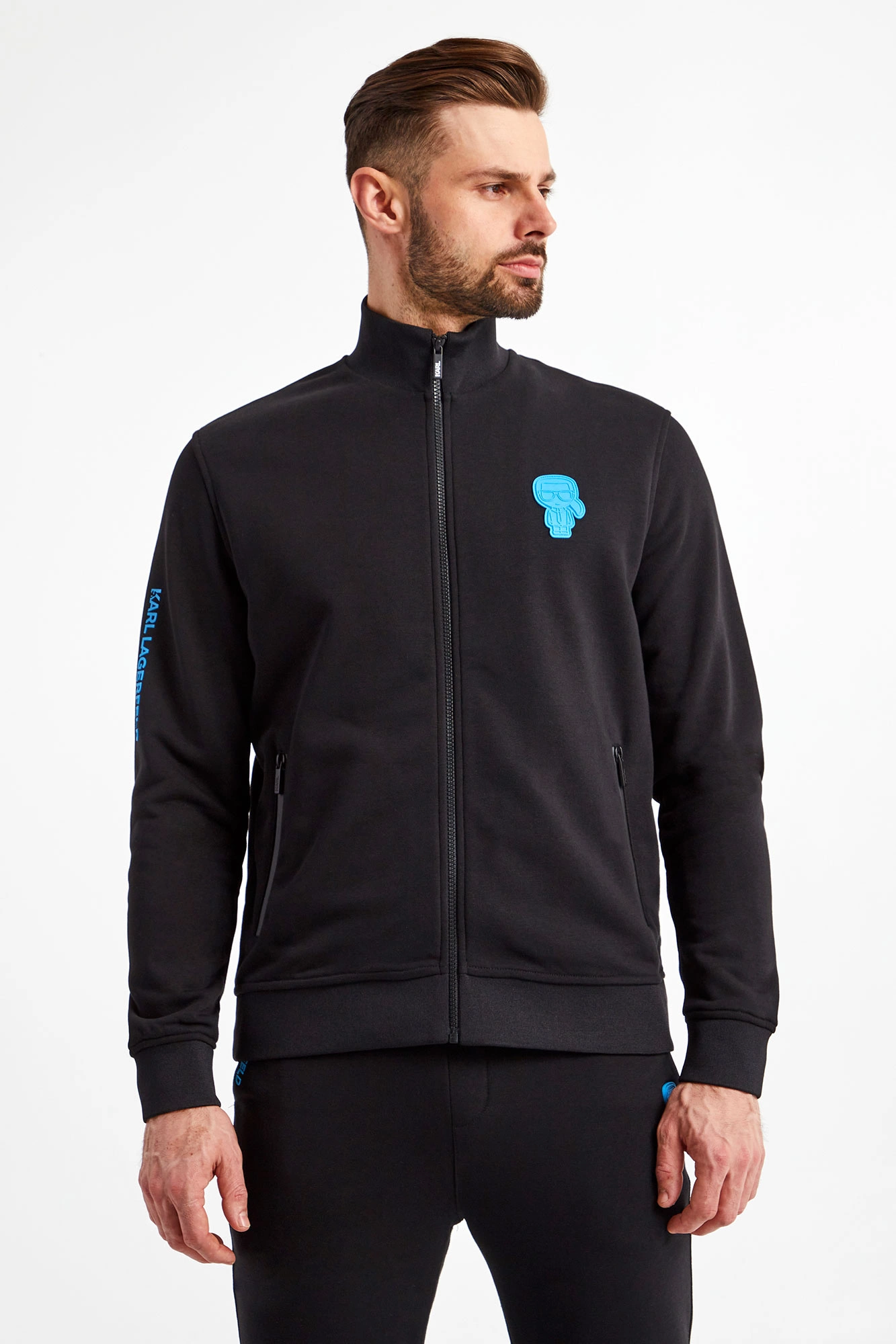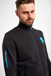 Bluza marki Karl Lagerfeld w czarnym kolorze, pochodząca z linii "Karl Cares", która wykorzystuje organiczne tkaniny, by wspierać zrównoważoną modę. Fason typu regular fit. Ze stójką. Z przodu gumowana aplikacja w postaci założyciela marki w niebieskim kolorze oraz dwie zapinane na zamek kieszenie po bokach. Długie rękawy i dół wykończone elastycznym ściągaczem. Z tyłu na ściągaczu nadruk w postaci nazwy marki w niebieskim kolorze. Na prawym rękawie gumowana aplikacja w postaci nazwy marki w niebieskim kolorze. Wykonana z elastycznej bawełny.