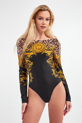 Body marki Versace Jeans Couture w czarnym kolorze. Fason typu slim fit. Na całości zwierzęcy nadruk i charakterystyczny dla marki, barokowy wzór w złotym kolorze. Na plecach głęboki dekolt. Długie rękawy. Zapinane na dole na napy. Wykonane z bardzo elastycznej tkaniny.