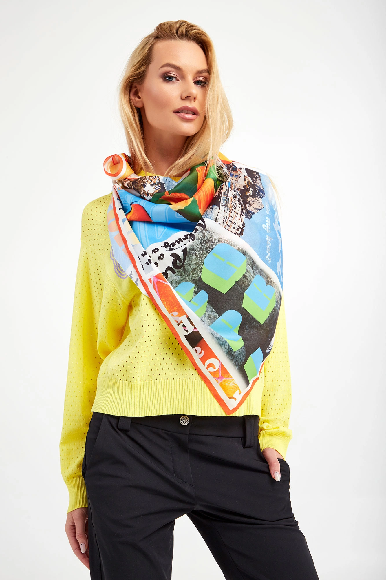 Chusta marki Ice Play. Na całości wielokolorowy wzór w postaci kolażu. Wykonany z gładkiej tkaniny. Niezwykle stylowy dodatek do stylizacji.