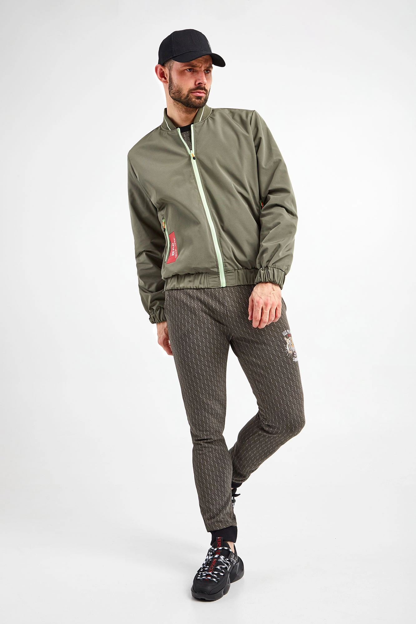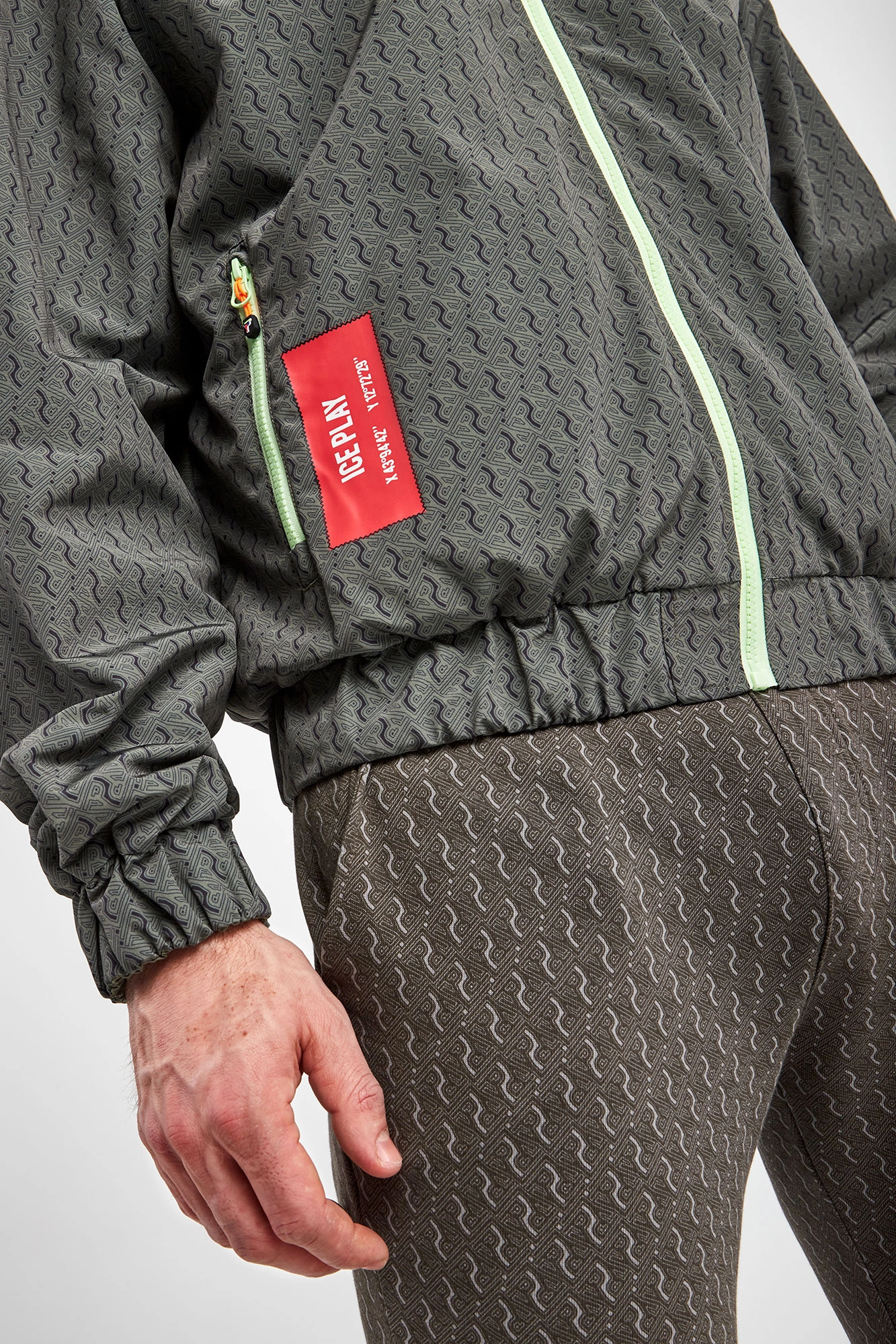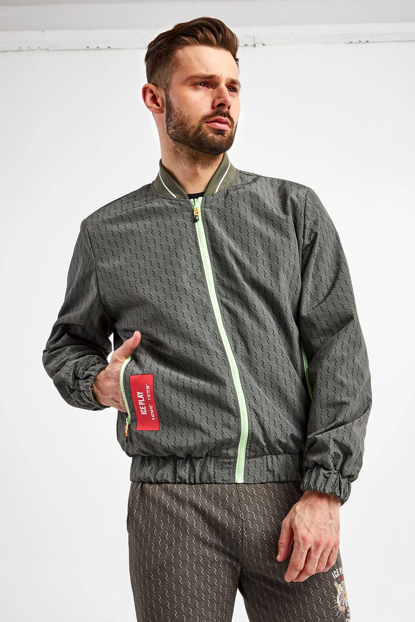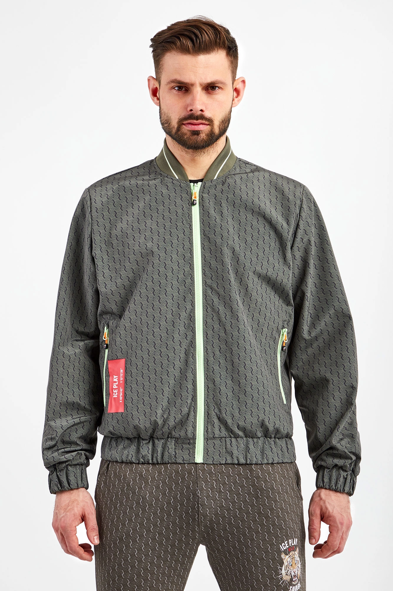 Dwustronna bomberka marki Ice Play w kolorach zielonym oraz khaki. Fason regular fit. Z jednej strony gładka, z drugiej we wzór z monogramem marki. Zapinana za pomocą jasnozielonego zamka z sygnowaną, neonową zawieszką. Dwie boczne, zamykanie kieszenie. Z boku nadruk z logo. Kołnierz ze stójką. Rękawy i dół zakończone ściągaczami.