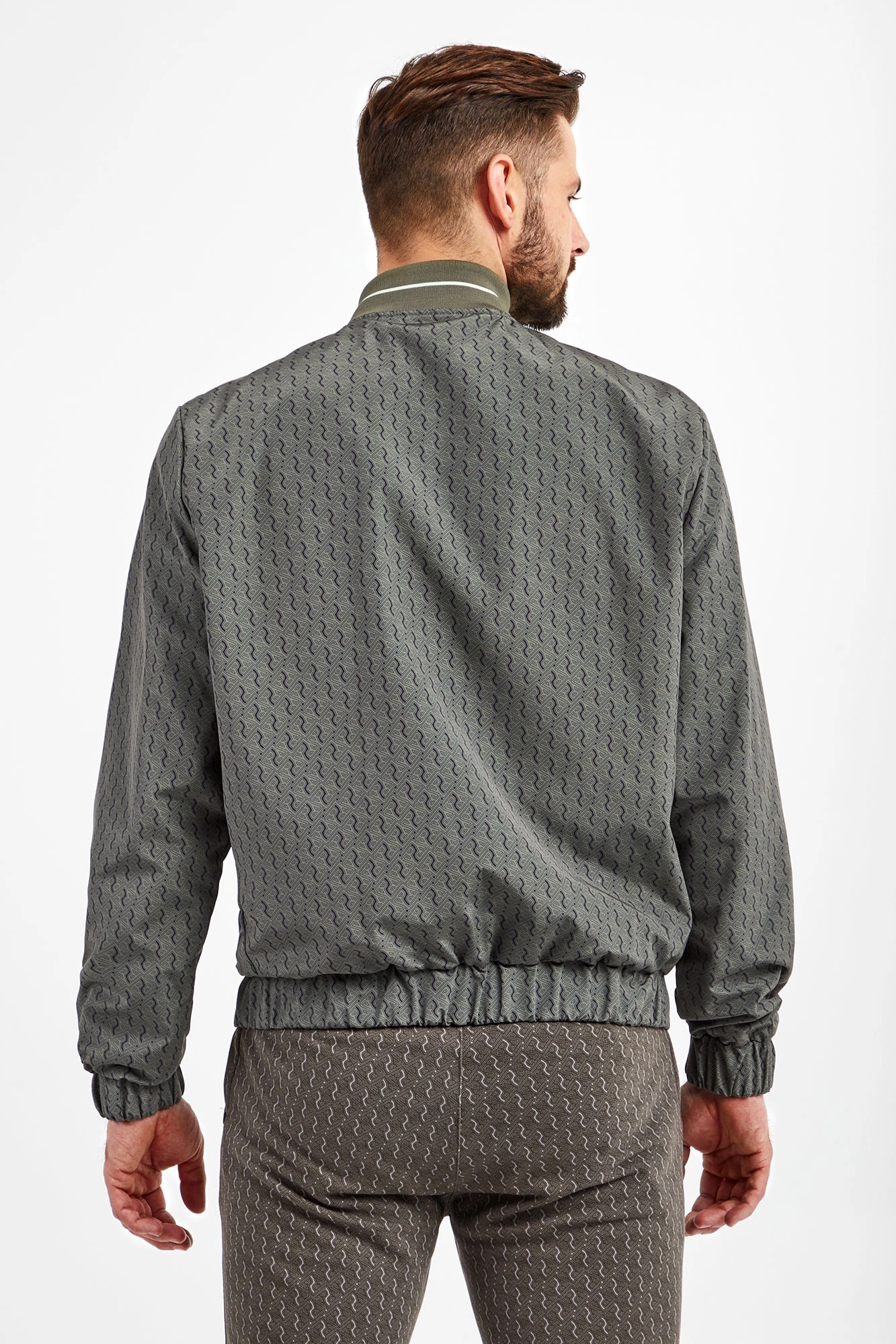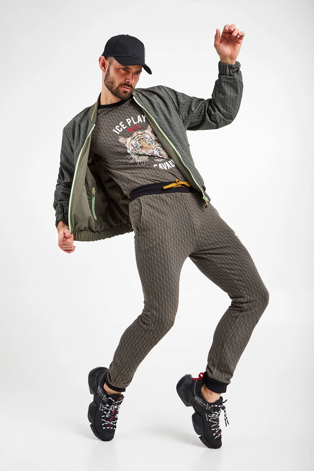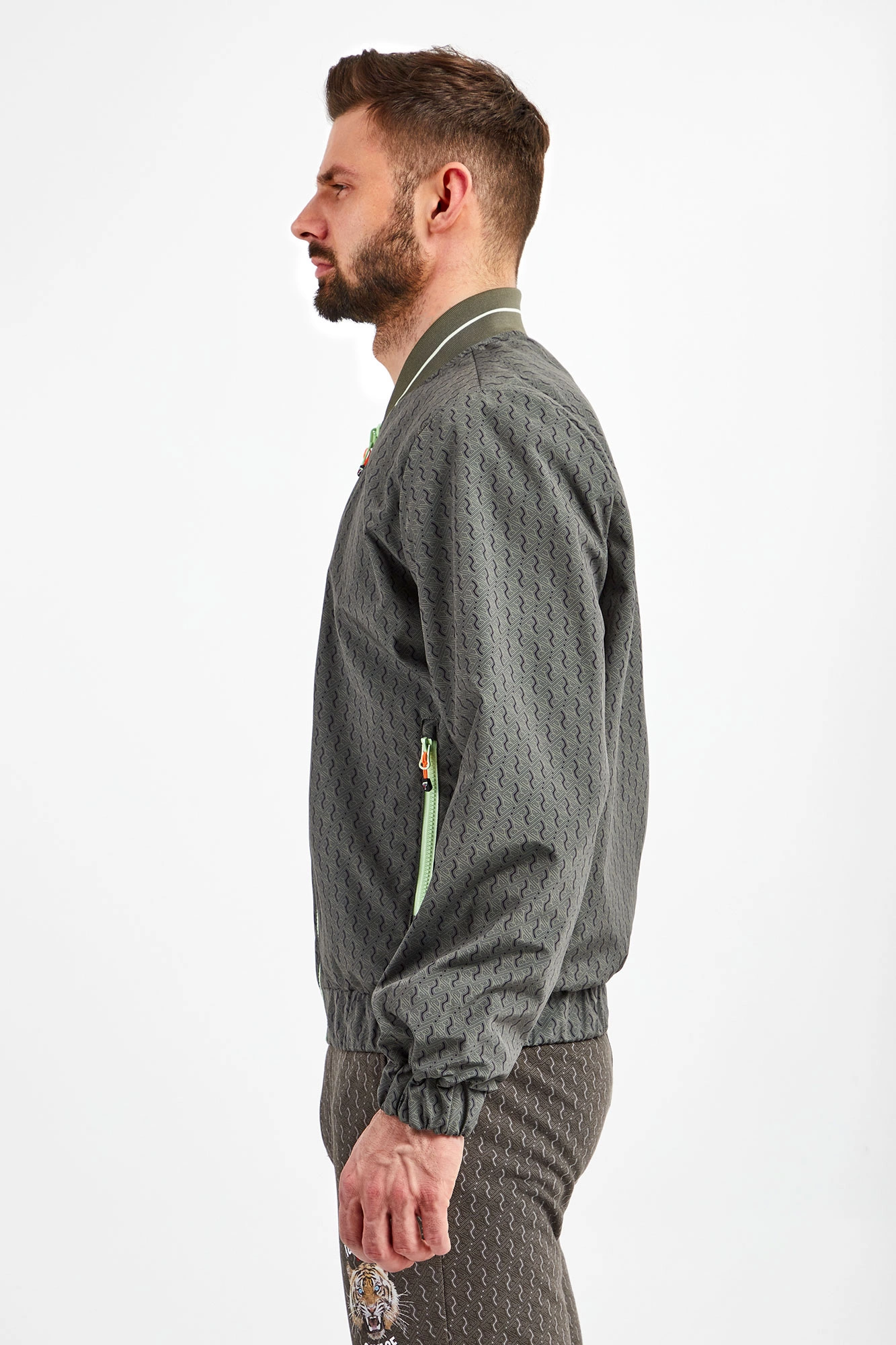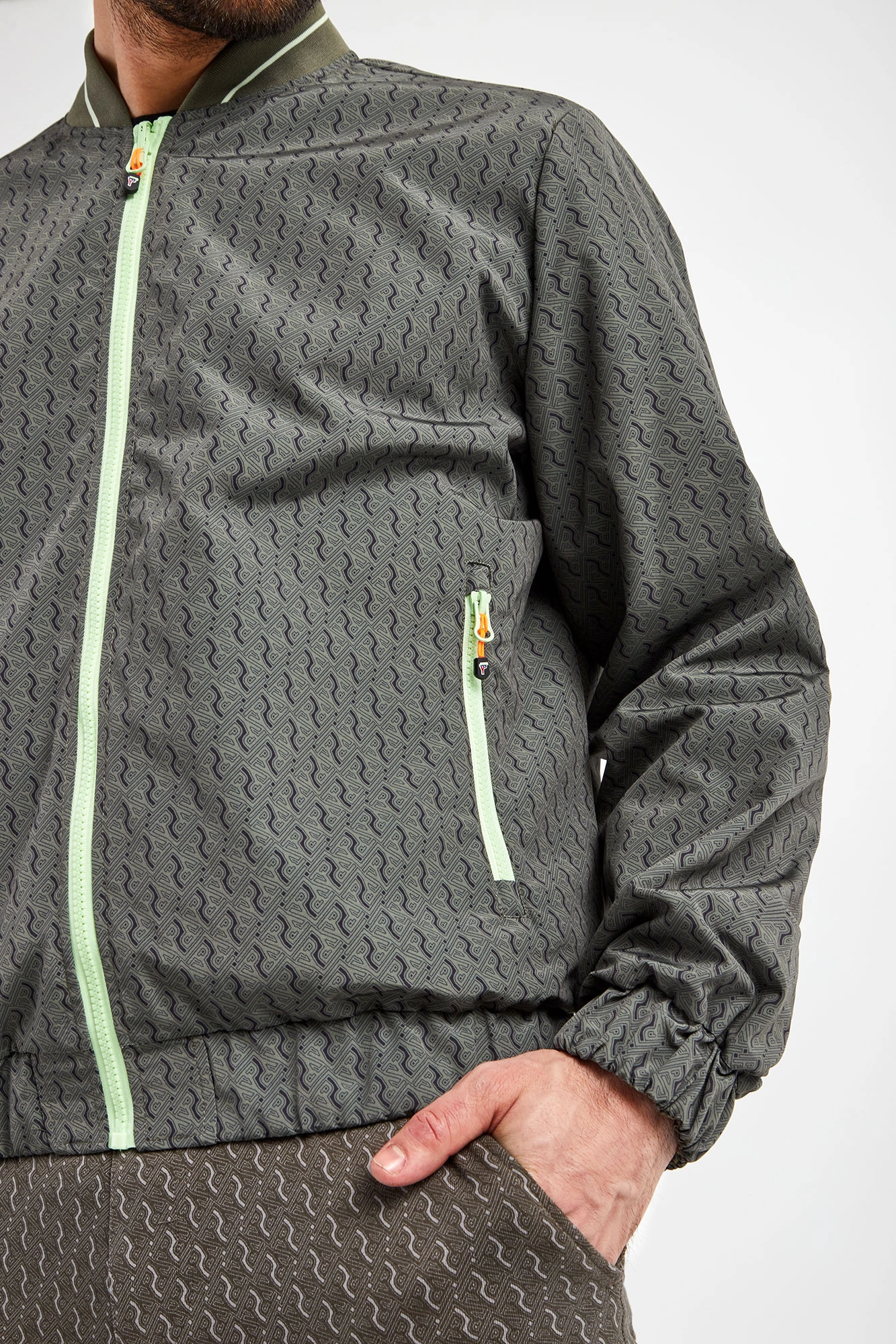 Dwustronna bomberka marki Ice Play w kolorach zielonym oraz khaki. Fason regular fit. Z jednej strony gładka, z drugiej we wzór z monogramem marki. Zapinana za pomocą jasnozielonego zamka z sygnowaną, neonową zawieszką. Dwie boczne, zamykanie kieszenie. Z boku nadruk z logo. Kołnierz ze stójką. Rękawy i dół zakończone ściągaczami.