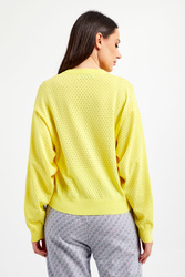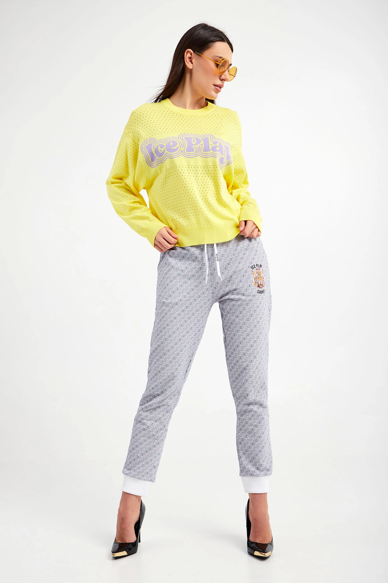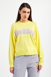 Sweter marki Ice Play w słonecznym, żółtym kolorze. Fason regular fit. Wykonany z ażurowej, dziurkowanej, wiskozowej tkaniny. Z przodu poziomy pas z liliowym, kontrastującym logo. Dekolt typu o-neck, długie rękawy i dół wykończone elastycznymi ściągaczami.