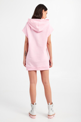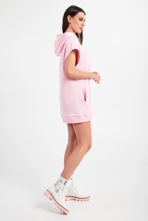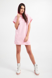 Sukienka z kapturem marki Twinset w kolorze pudrowego różu. Z przodu różowy haft z logo. Krótkie, reglanowe rękawy zakończone lamówką. Dwie boczne, wpuszczane kieszenie. Dół zakończony ściągaczem. Wykonana z czystej, przyjemnej w dotyku bawełny.