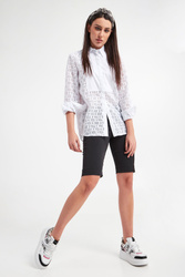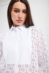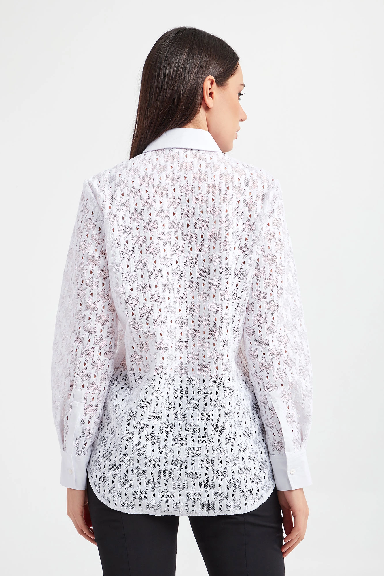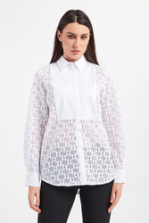 Koszula marki Karl Lagerfeld w białym kolorze. Fason regular fit. Wykonana z koronkowej, ażurowej tkaniny we wzór z monogramem marki. Na biuście gładka wstawka z haftowanym logo. Zapinana za pomocą opalizujących, sygnowanych guzików. Klasyczny kołnierzyk. Rękawy zakończone zapinanymi mankietami.