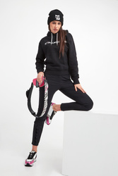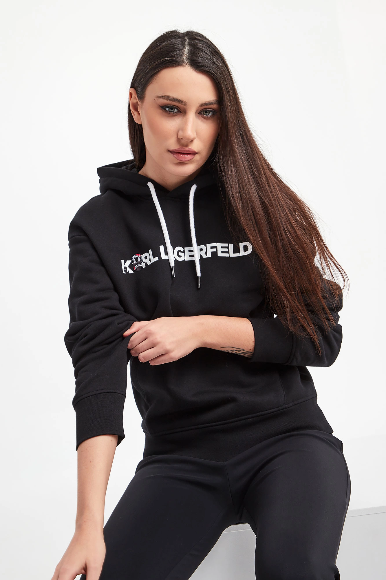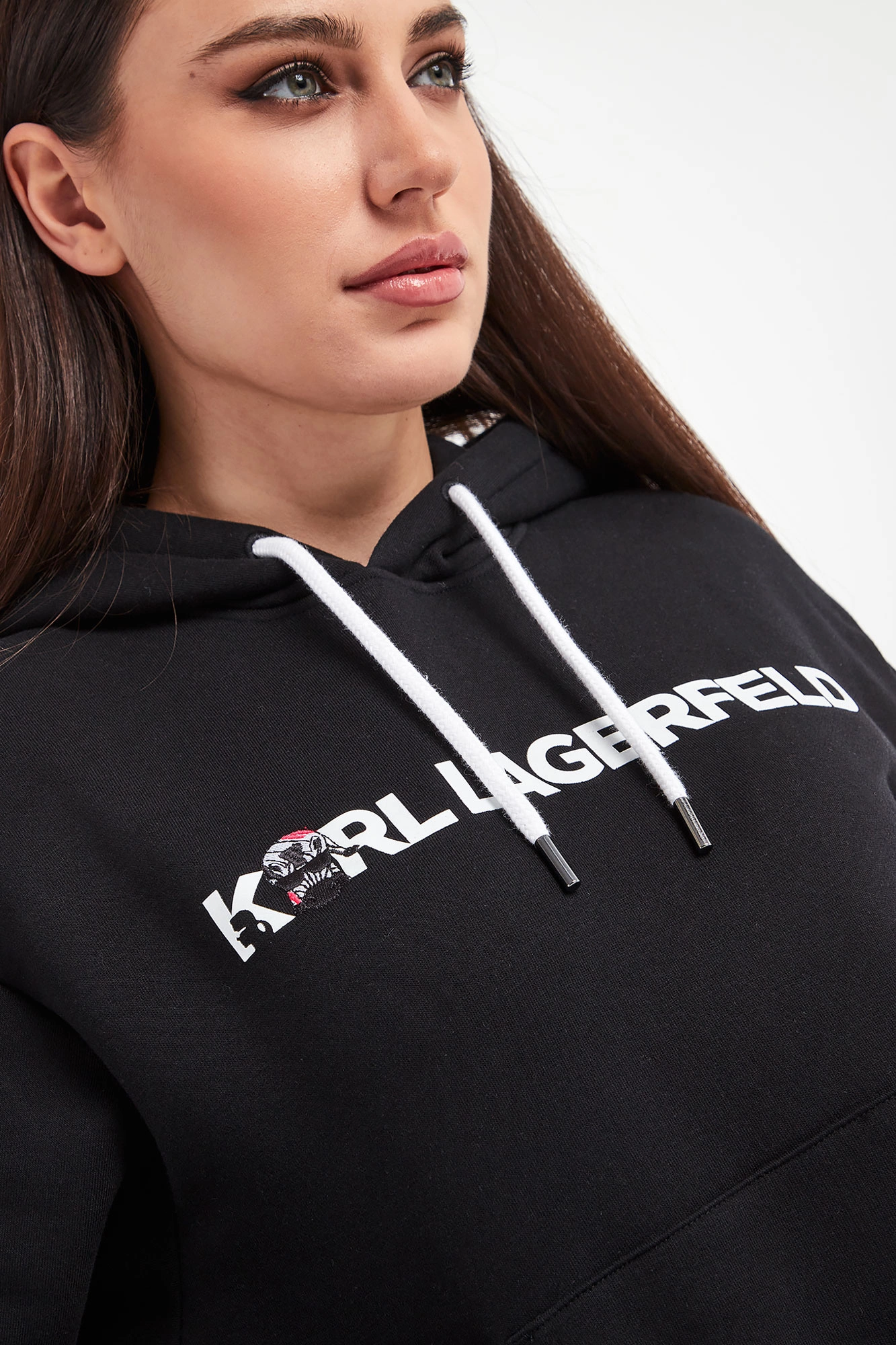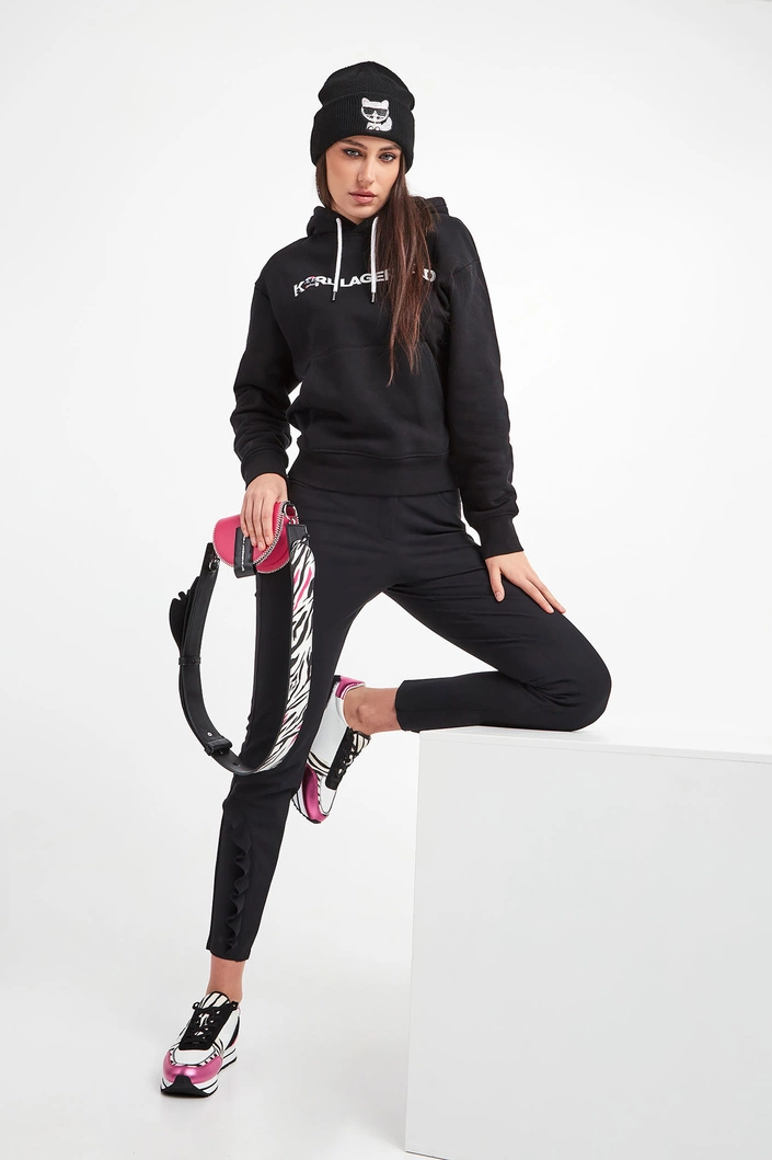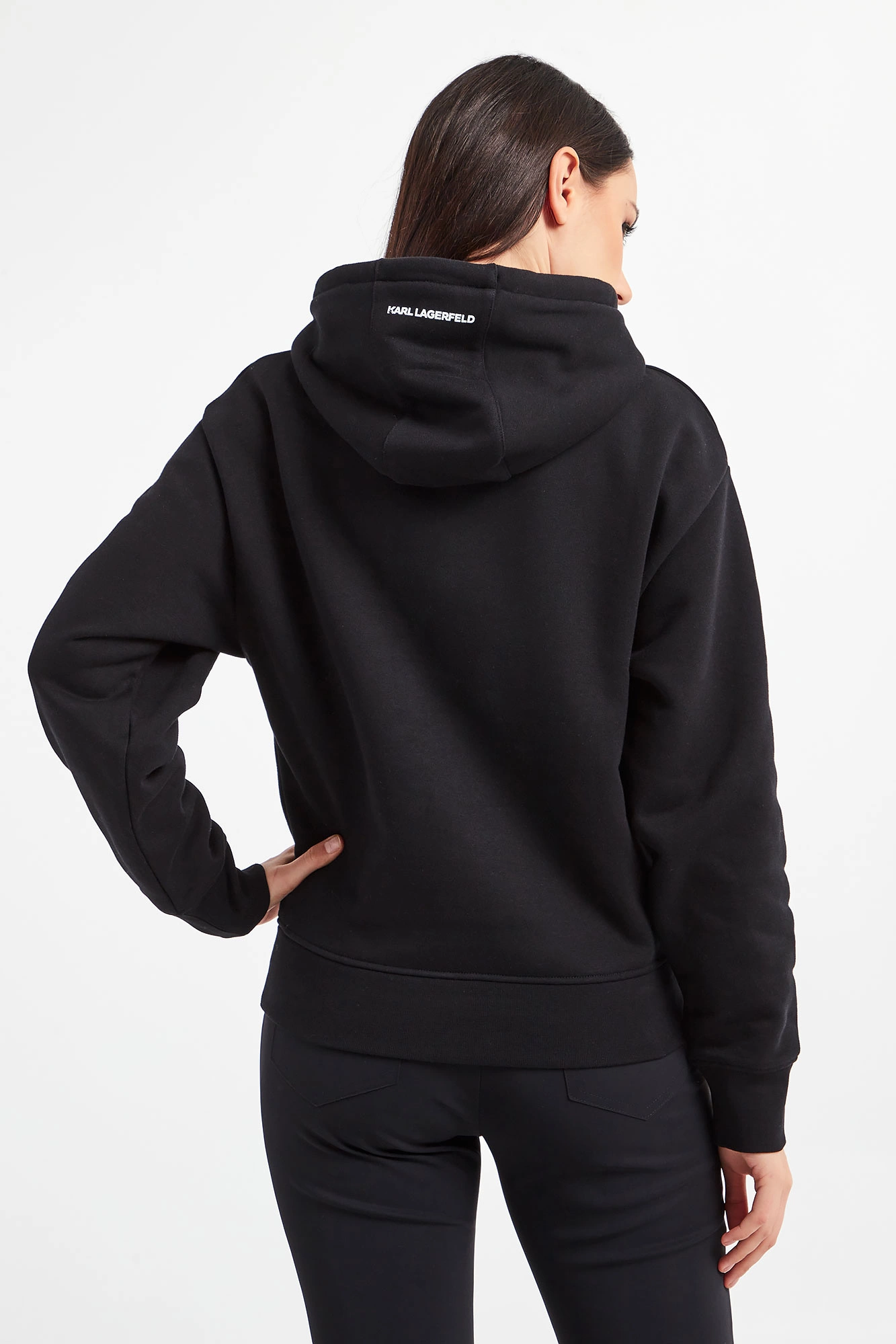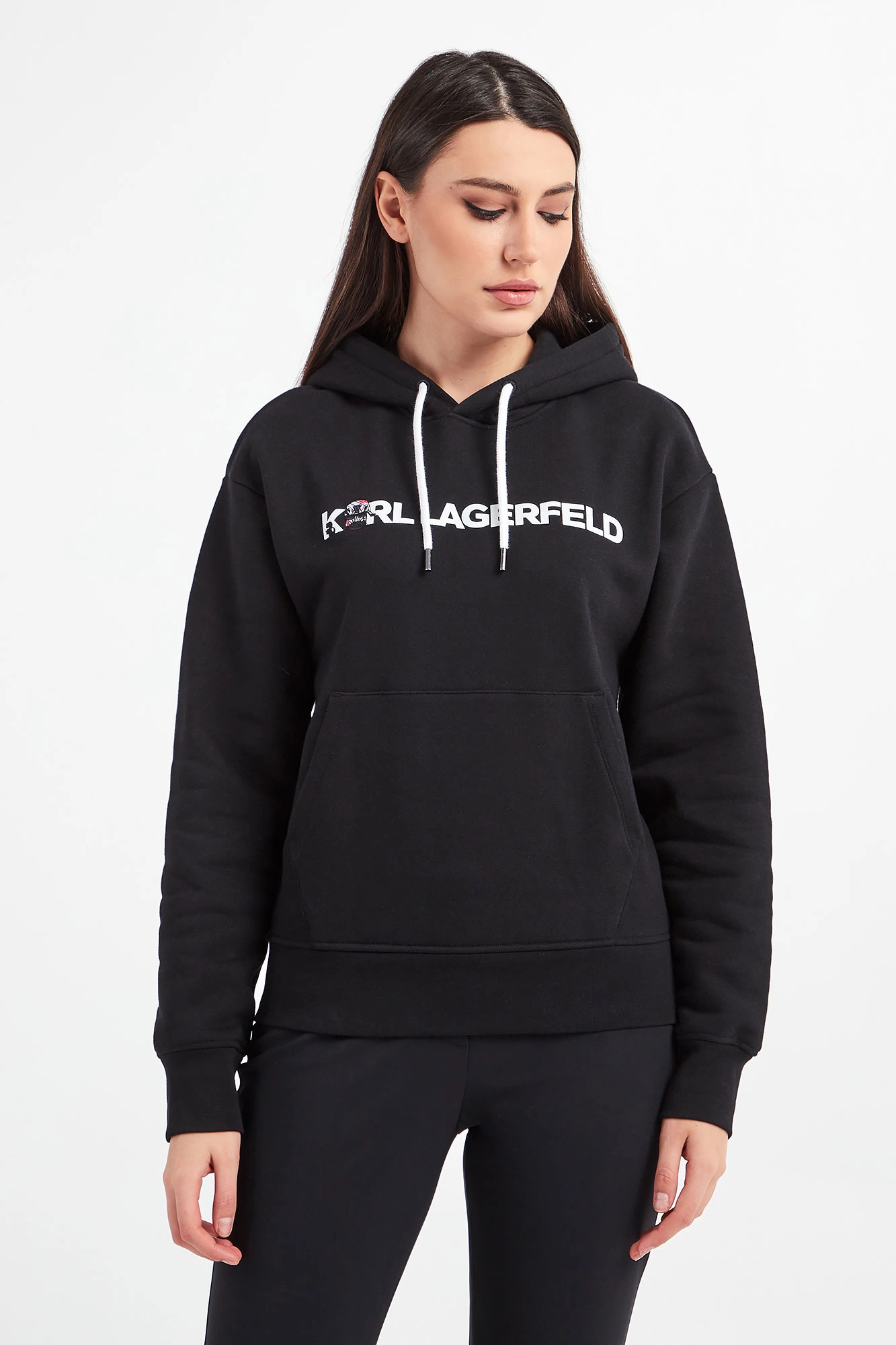 Bluza z kapturem marki Karl Lagerfeld w czarnym kolorze. Model z linii Karl Cares, która wspiera zrównoważona modę. Prosty fason typu regular fit. Kaptur regulowany za pomocą troczków. Rękawy oraz dół wykończone elastycznym ściągaczem. Z przodu nadruk w postaci nazwy marki w białym kolorze oraz kieszeń typu kangurka. W całości wykonana z bawełny organicznej.