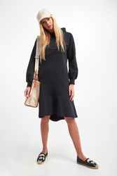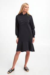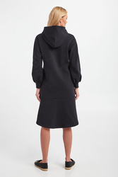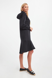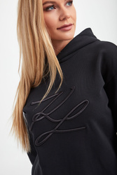 Sukienka z kapturem marki Karl Lagerfeld w czarnym kolorze. Fason typu relaxed fit długości midi. Z przodu czarny haft z logo marki. Długie rękawy wykończone ściągaczem. Dół zakończony falbaną. Wykonana z czystej, przyjemnej w dotyku bawełny.