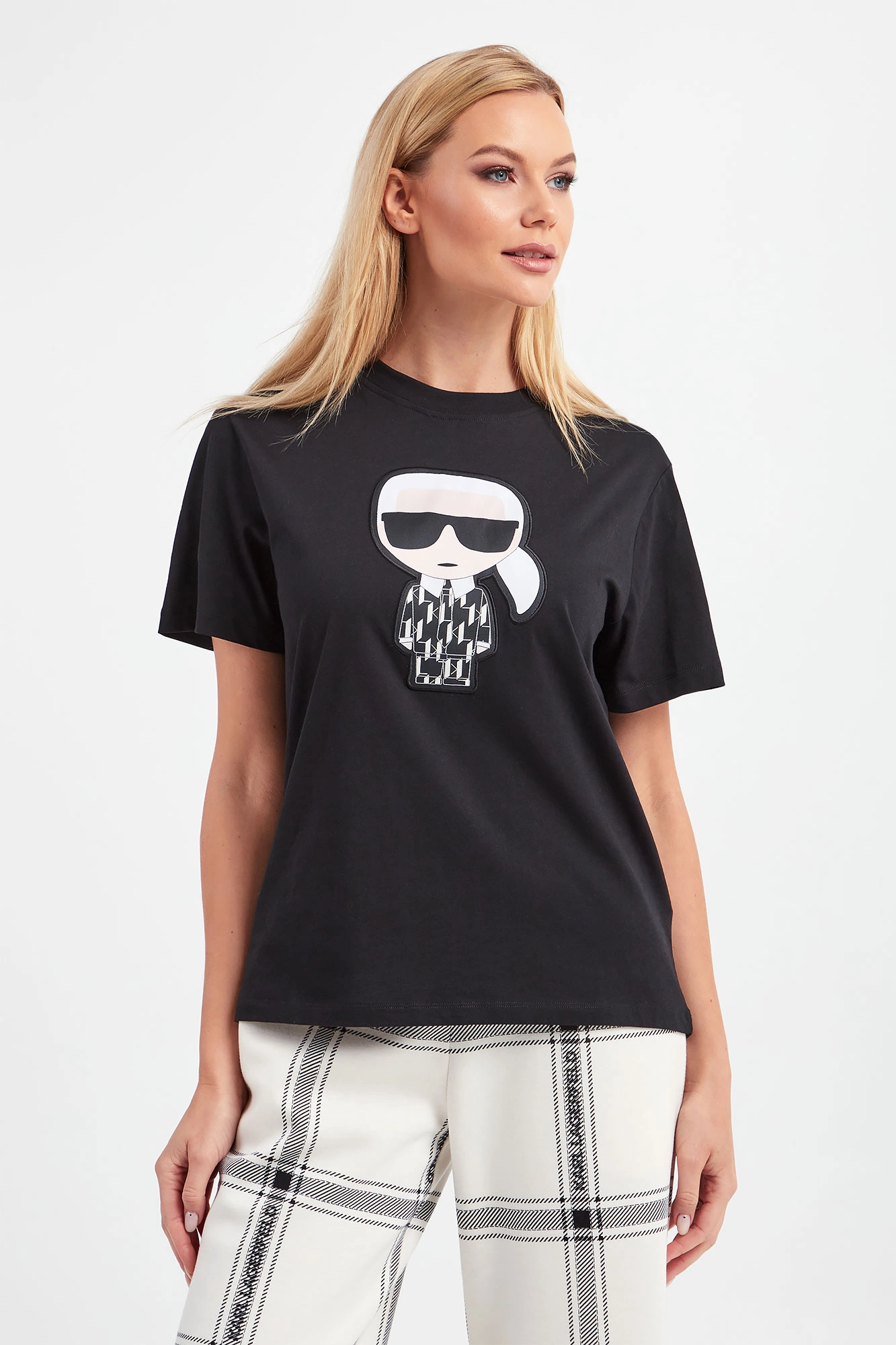 T-shirt marki Karl Lagerfeld w czarnym kolorze. Pochodzi z linii "Karl Cares", która wykorzystuje tkaniny pochodzące z recyklingu, by wspierać zrównoważoną modę. Prosty fason typu regular fit. Dekolt typu o-neck. Z przodu duża, aplikacja z charakterystycznym wizerunkiem założyciela i byłego dyrektora kreatywnego marki. Na linii karku niewielki nadruk z nazwą marki w białym kolorze. T-shirt w całości wykonany z bawełny organicznej. Unikatowy i ponadczasowy.