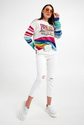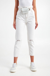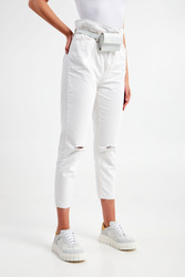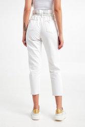 Jeansy marki Liu Jo w białym kolorze. Fason typu boyfriend o kroju paperbag. Wysoki stan. Góra wykończona ozdobna falbaną. Zapinane za pomocą sygnowanego guzika i zamka błyskawicznego. W talii szlufki. Z przodu ozdobne rozdarcia. Nogawki wykończone strzępieniem. Model z czterema kieszeniami. Na całości brązowe przeszycia. Z tyłu metalowa aplikacja z tłoczoną nazwą marki. Wykonane z czystej bawełny o grubym splocie. W zestawie nerka/torebka w białym kolorze.