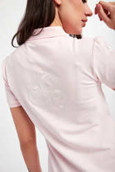 Sukienka marki Joop! w pastelowym, różowym kolorze. Model pochodzi z linii wspierającej zrównoważona modę. Fason typu slim. Długość mini. Z klasycznym kołnierzem. Zapinanym za pomocą sygnowanych guzików. Krótkie rękawy zakończone elastycznym ściągaczem. Z przodu haft z nazwą marki w białym kolorze i metalowa aplikacja z tłoczoną nazwy marki. Na dole niewielkie, ozdobne rozcięcia. Z tyłu duży haft z nazwą marki w białym kolorze. Wykonana z elastycznej bawełny.