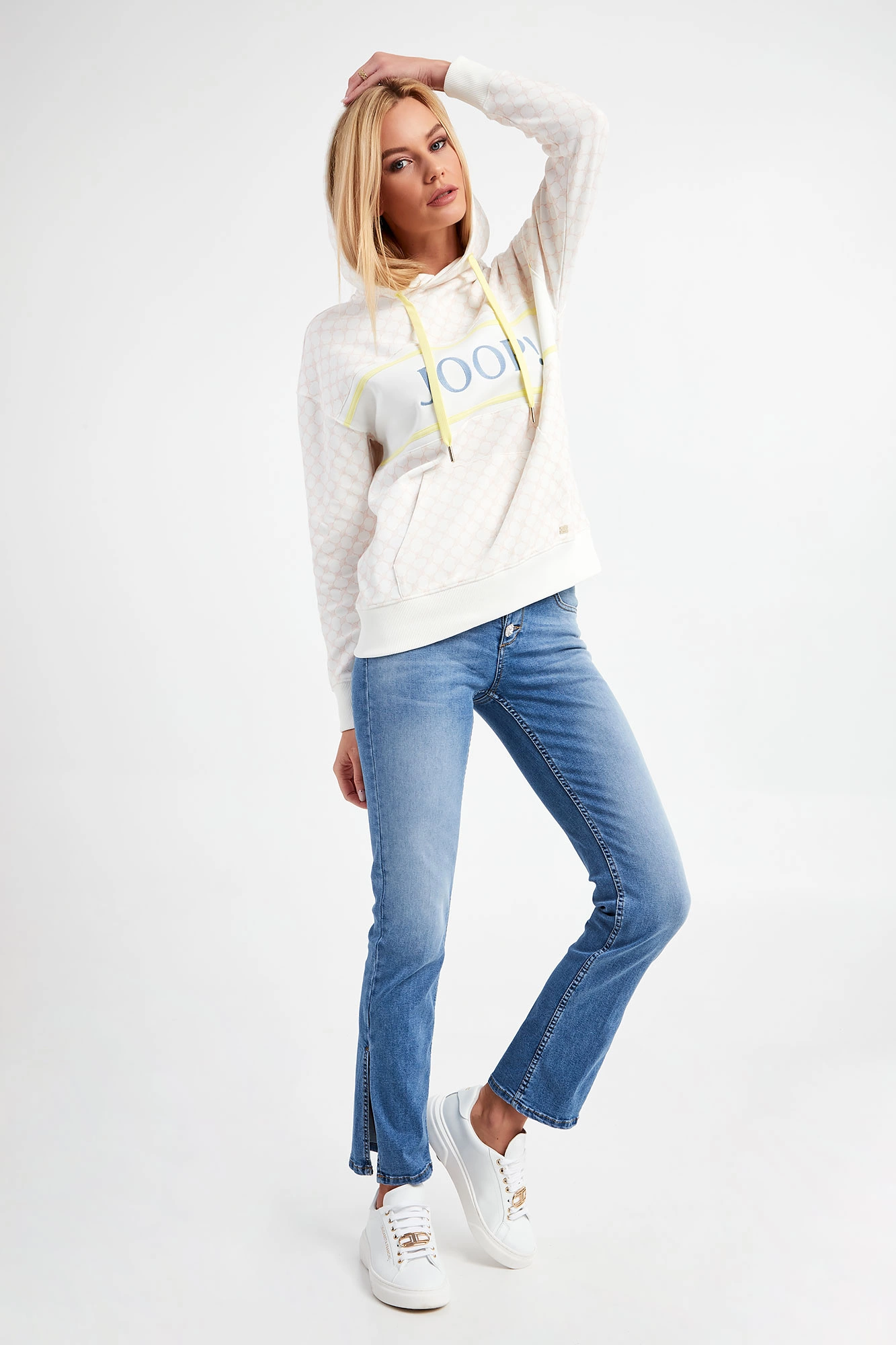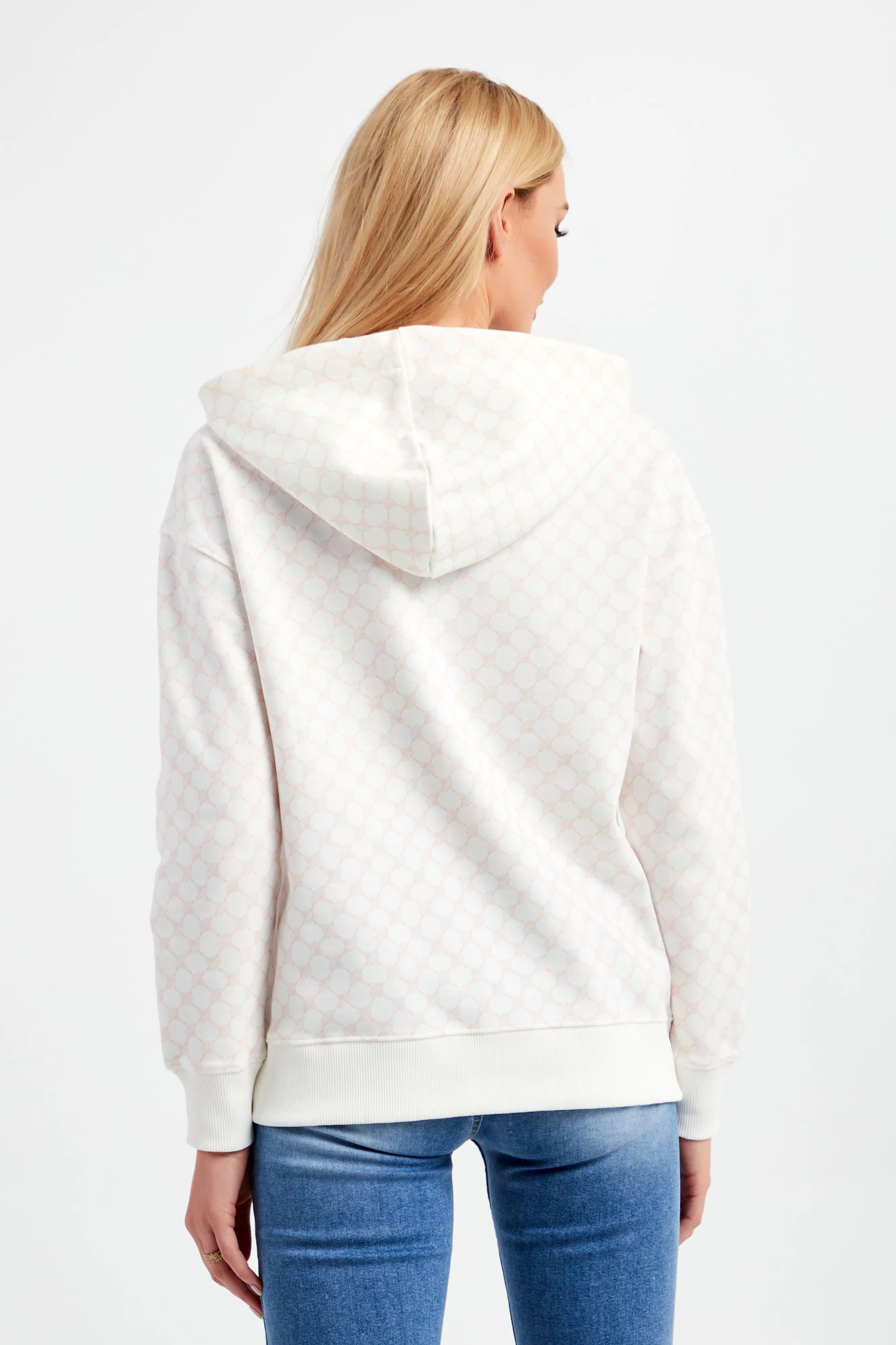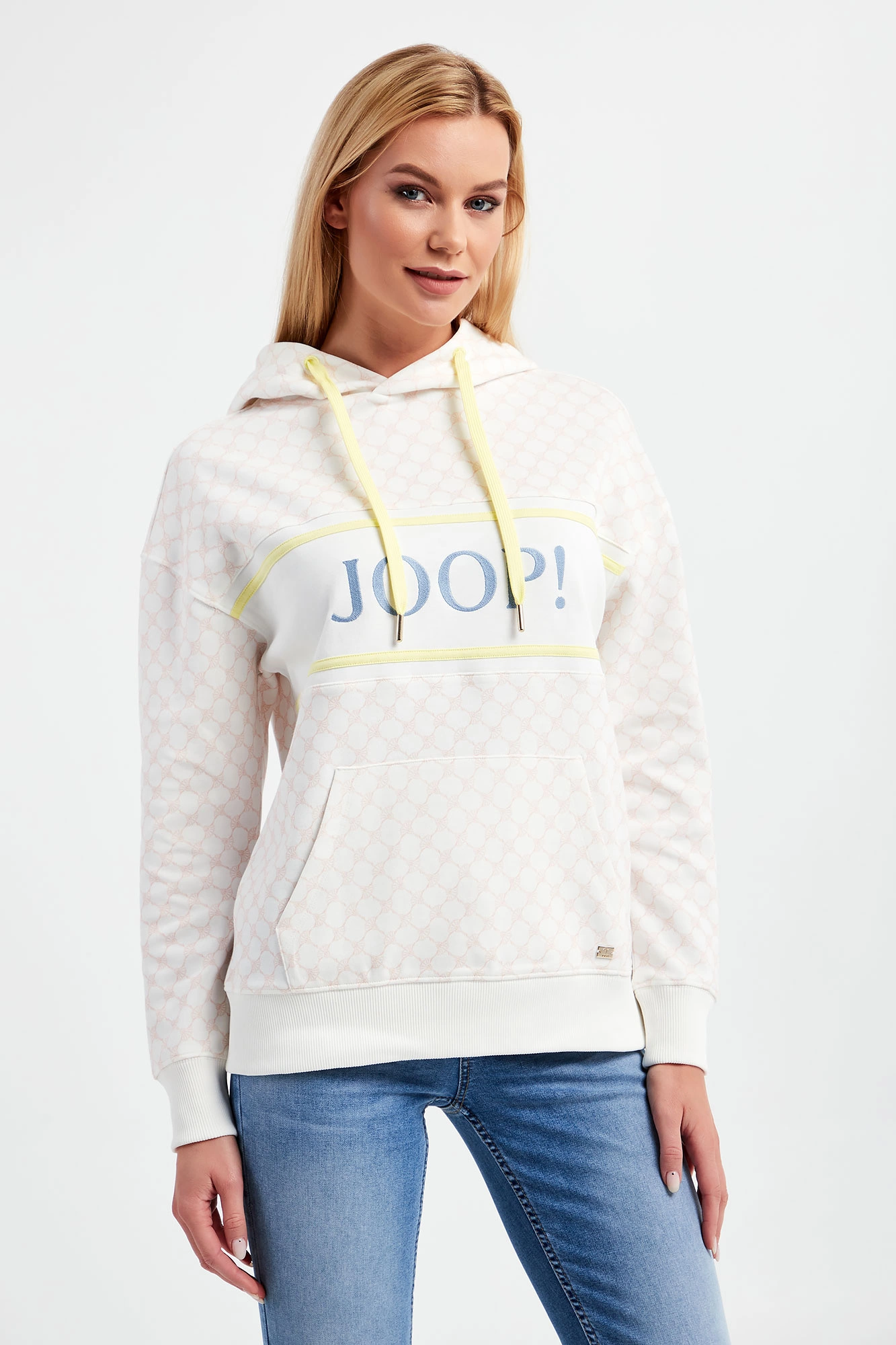 Bluza z kapturem marki Joop! w białym kolorze. Na całości jasnoróżowy wzór z logo. Z przodu niebieski haft z nazwą marki oraz żółte, poziome paski. Z przodu jedna kangurkowa kieszeń. Z boku złota, sygnowana zawieszka. Kaptur regulowany za pomocą żółtych troczków. Rękawy i dół zakończone ściągaczami. Wykonana z miękkiej, bawełnianej tkaniny.