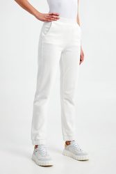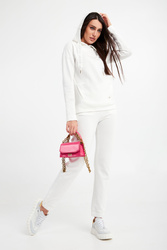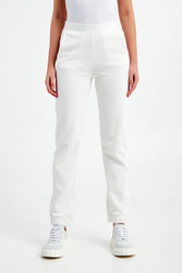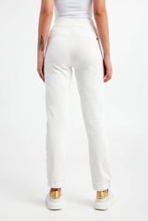 Spodnie dresowe marki Joop! w białym kolorze. Fason typu jogger. W pasie szeroki, sygnowany ściągacz. Dwie boczne, wpuszczane kieszenie. Z tyłu złota, logowana zawieszka oraz patki imitujące kieszenie. Po bokach lampasy. Nogawki zakończone ściągaczami. Wykonane z bawełnianej tkaniny z dodatkiem elastycznych włókien.