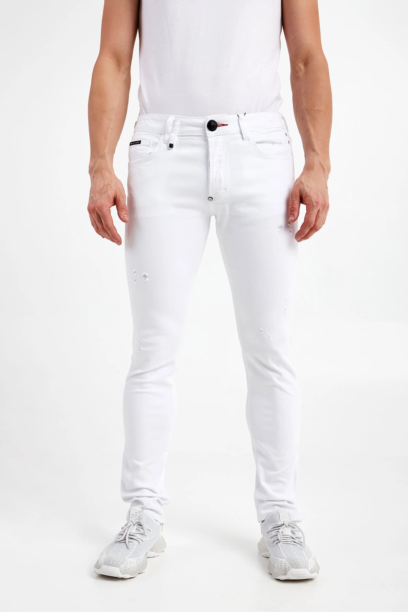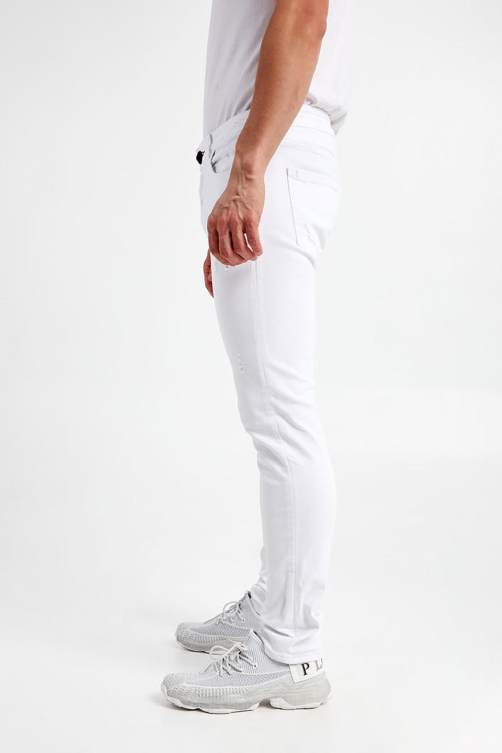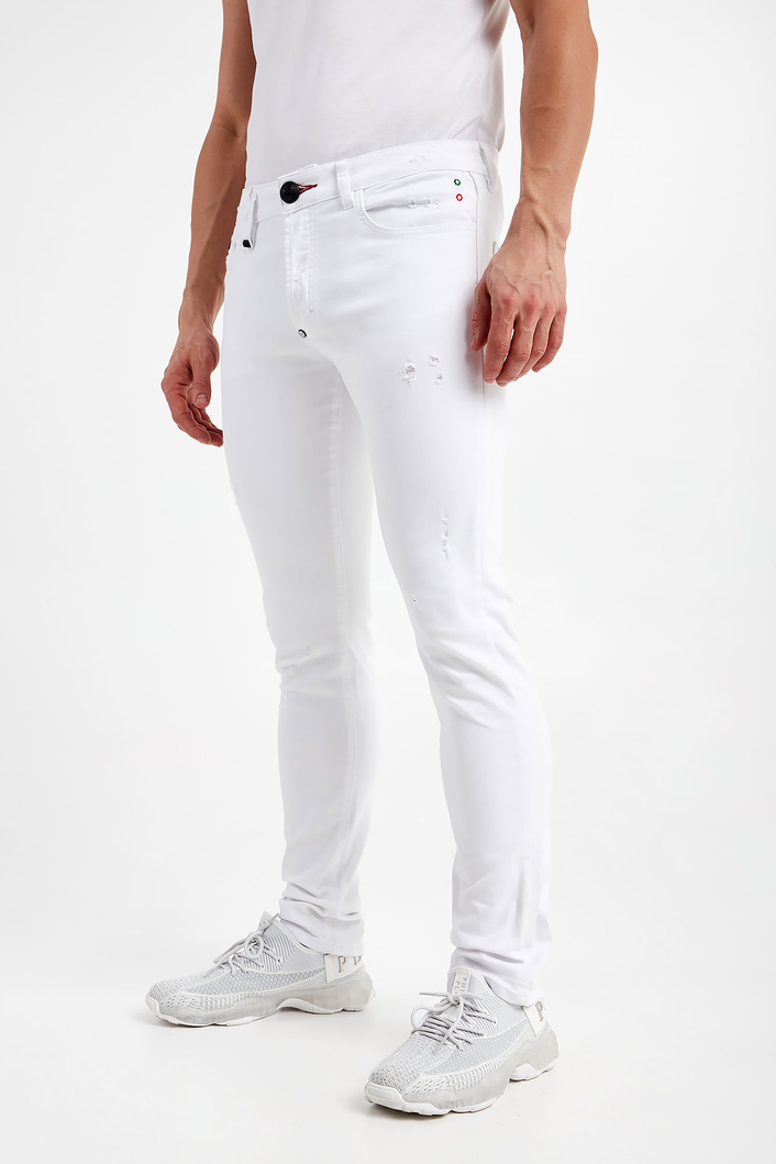 Jeansy marki Philipp Plein w białym kolorze. Fason typu skinny iconic. W talii szlufki. Zapinane za pomocą sygnowanego, czarnego guzika i zamka błyskawicznego pokrytego tasiemką. Model z sześcioma kieszeniami. Na tylnej kieszeni nadruk z nazwą i logo marki w czarnym kolorze. Z tyłu naszywka w kontrastowym, czarnym kolorze z nadrukiem nazwy marki w białym kolorze. Wykonana z bawełny z domieszką elastanu.
