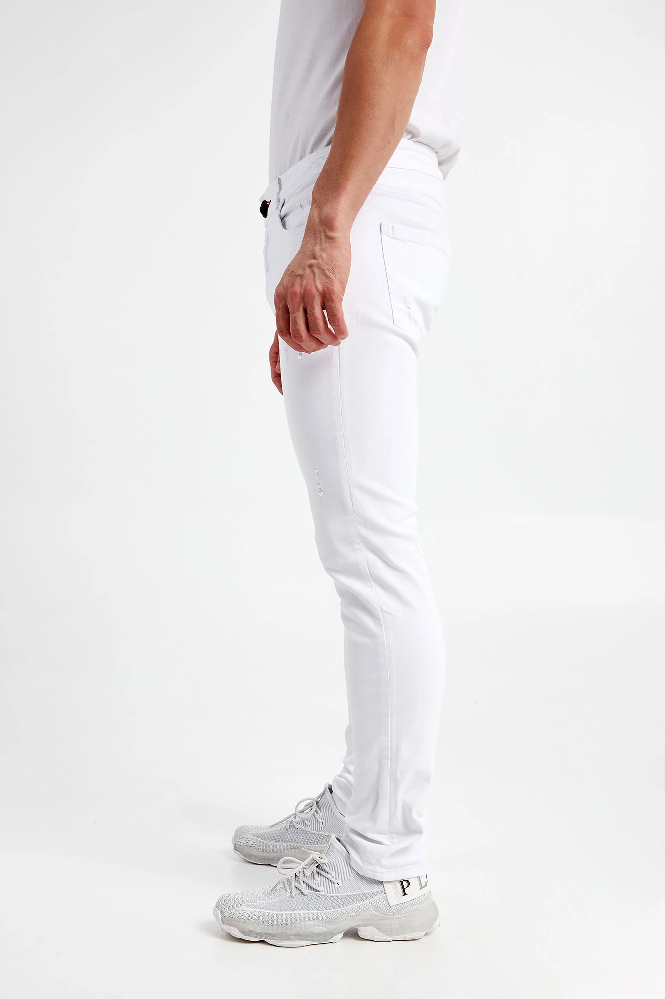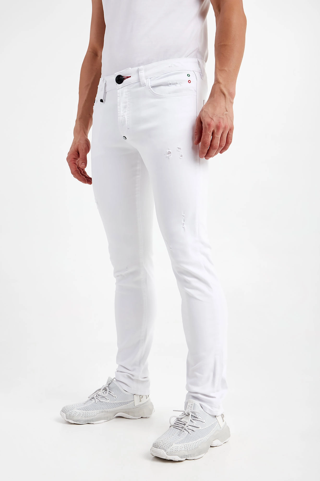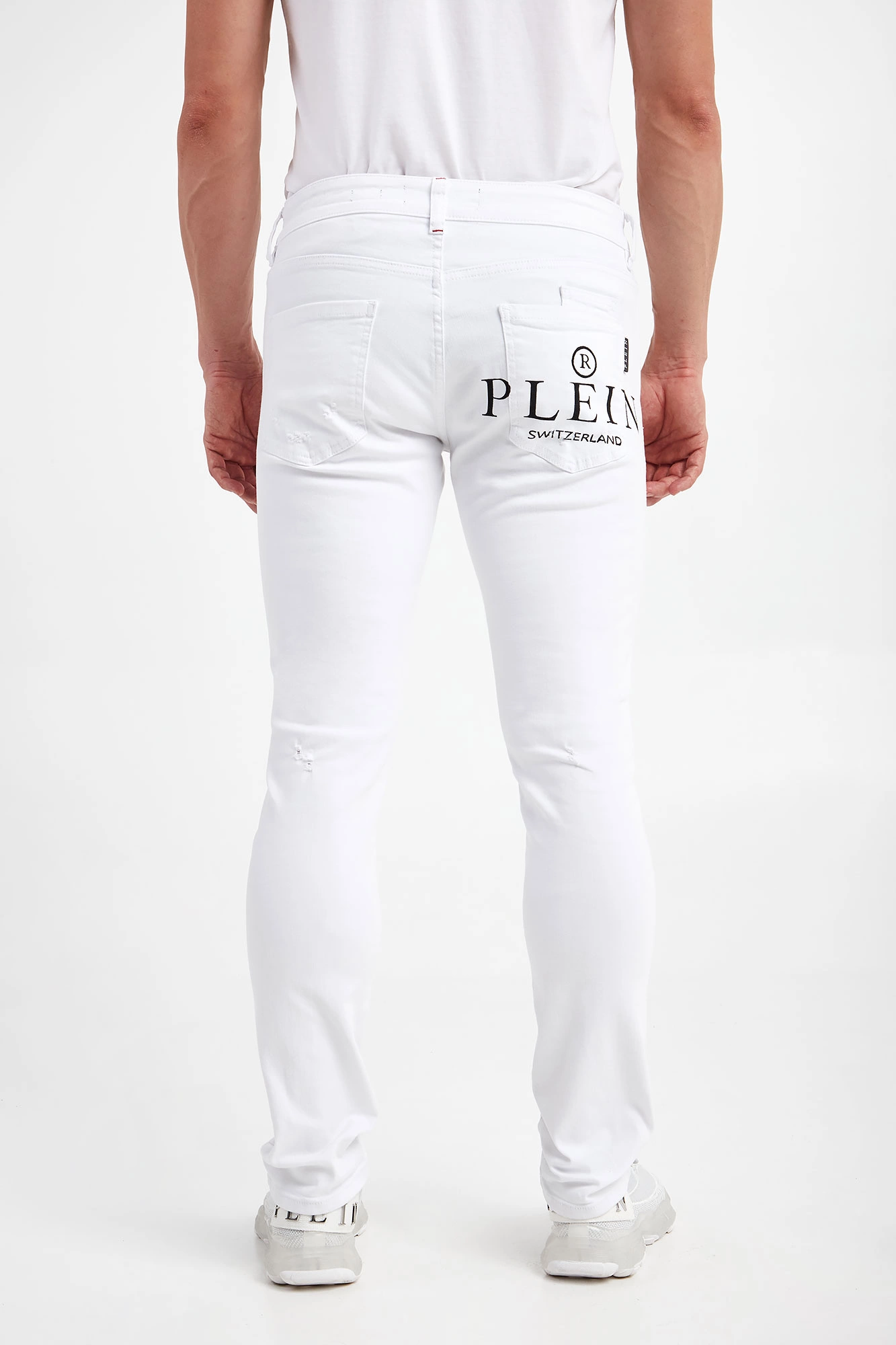 Jeansy marki Philipp Plein w białym kolorze. Fason typu skinny iconic. W talii szlufki. Zapinane za pomocą sygnowanego, czarnego guzika i zamka błyskawicznego pokrytego tasiemką. Model z sześcioma kieszeniami. Na tylnej kieszeni nadruk z nazwą i logo marki w czarnym kolorze. Z tyłu naszywka w kontrastowym, czarnym kolorze z nadrukiem nazwy marki w białym kolorze. Wykonana z bawełny z domieszką elastanu.
