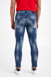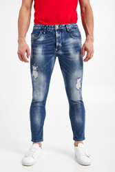 Jeansy marki Philipp Plein w niebieskim kolorze. Fason typu straight cut. W talii szlufki. Na całości ozdobne przetarcia. Zapinane za pomocą sygnowanego, srebrnego guzika i zamka błyskawicznego pokrytego tasiemką. Model z pięcioma kieszeniami. Z tyłu skórzana naszywka z tłoczoną nazwą marki. Z tyłu kolorowy haft. Wykonane z bawełny z domieszką elastanu.