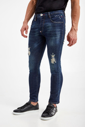 Jeansy marki Philipp Plein w granatowym kolorze. Fason typu straight cut. W talii szlufki. Na całości ozdobne przetarcia. Zapinane za pomocą sygnowanego, srebrnego guzika i zamka błyskawicznego pokrytego tasiemką. Model z pięcioma kieszeniami. Z tyłu skórzana naszywka z tłoczoną nazwą marki w beżowym kolorze. Z tyłu haft w kształcie logo marki w kontrastowym, czerwonym kolorze. Wykonana z bawełny z domieszką elastanu.
