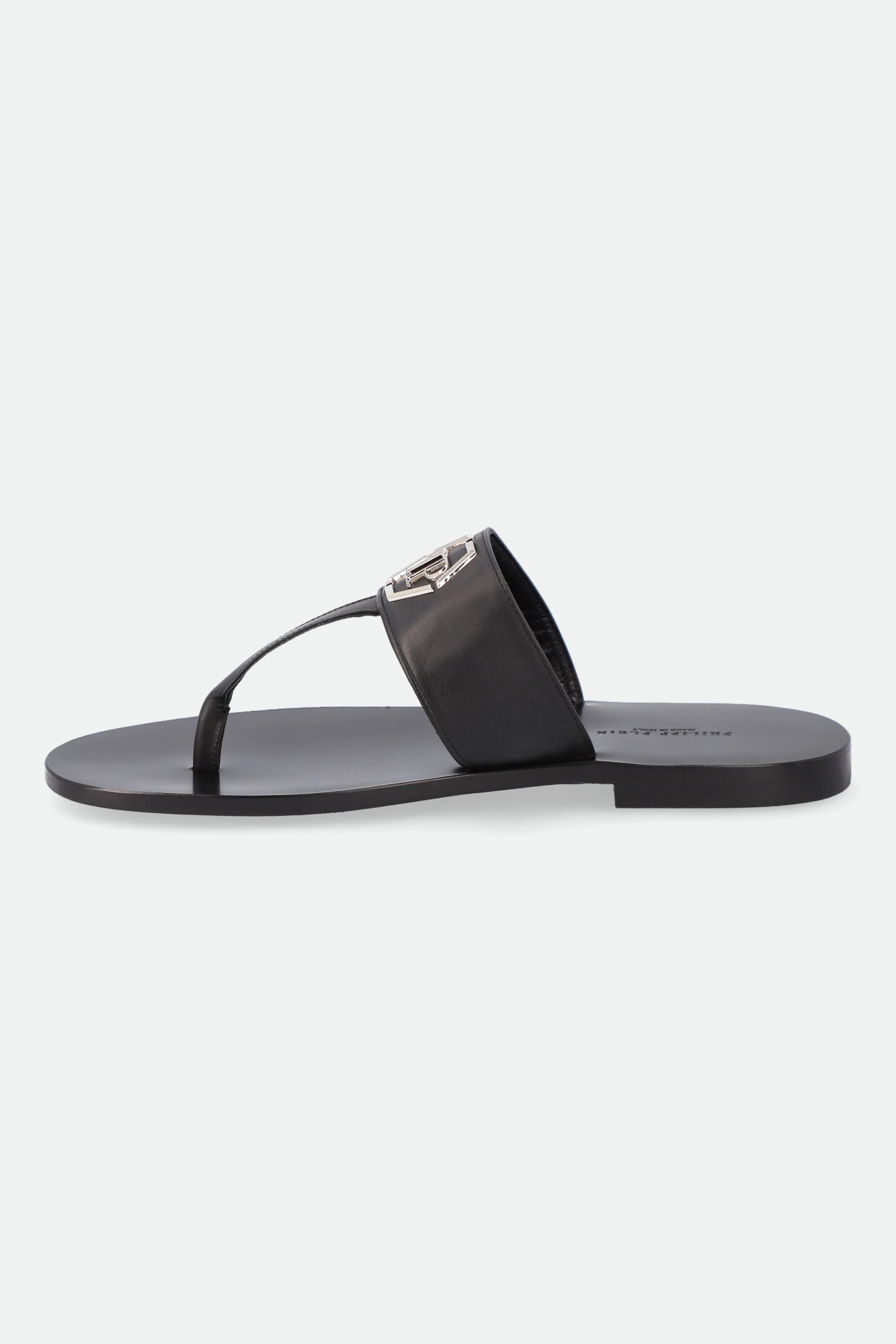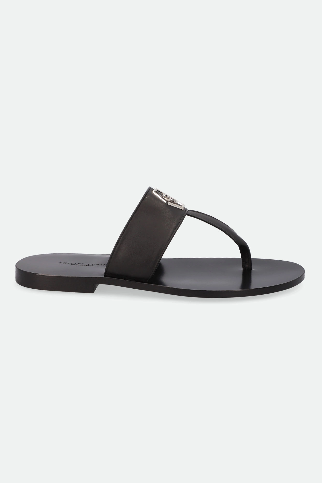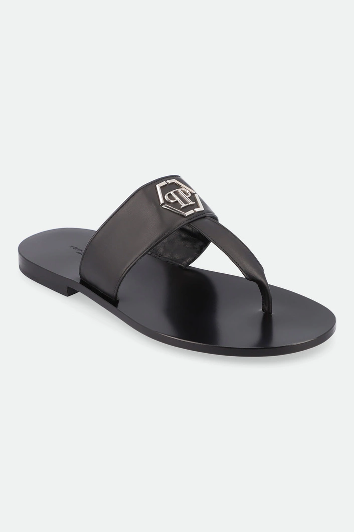 Japonki marki Philipp Plein w czarnym kolorze. Paski w kształcie litery T. Na pasku metalowa aplikacja z logo marki w srebrnym kolorze. Skórzana wkładka z tłoczoną nazwą marki. Wykonane z naturalnej skóry cielęce.