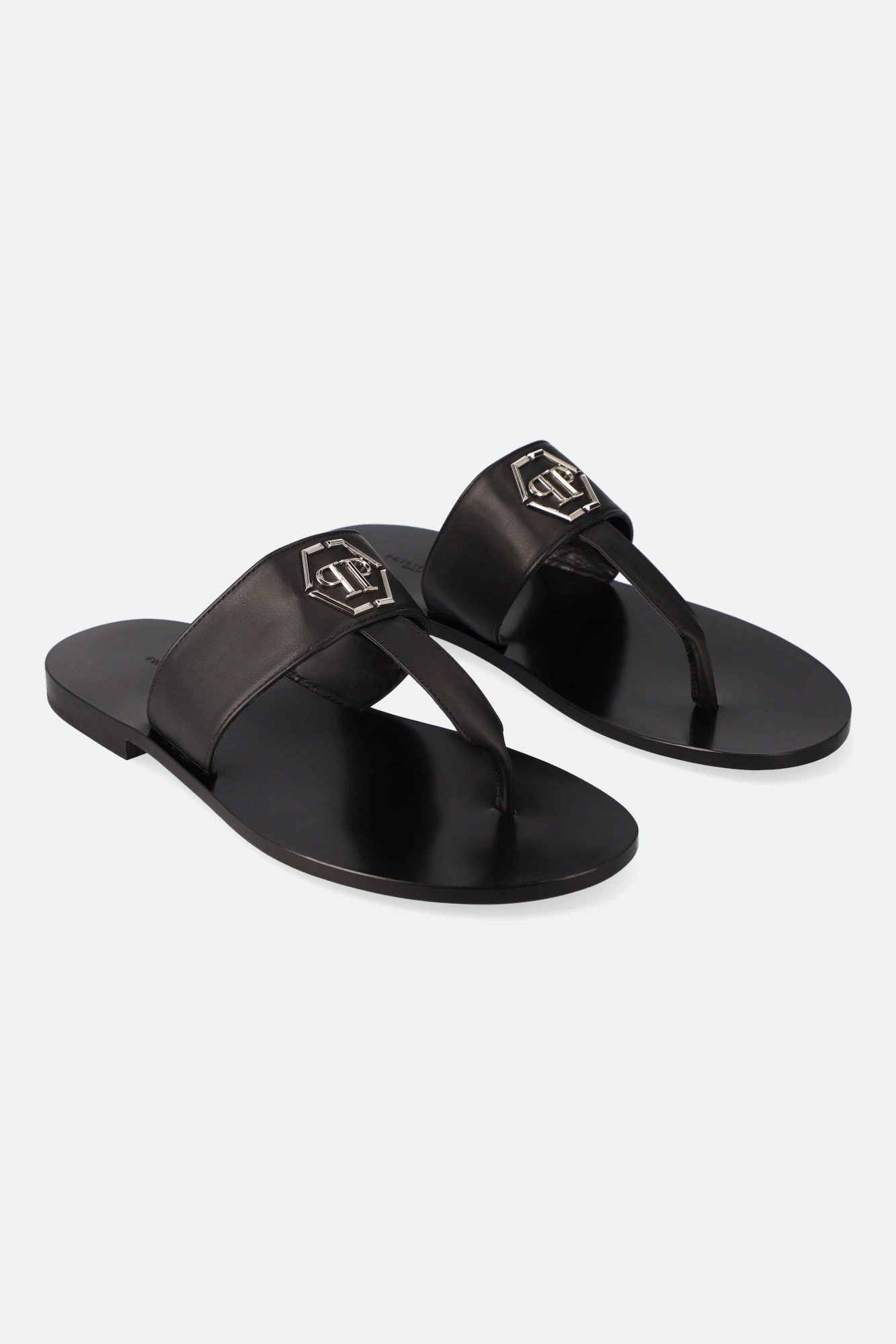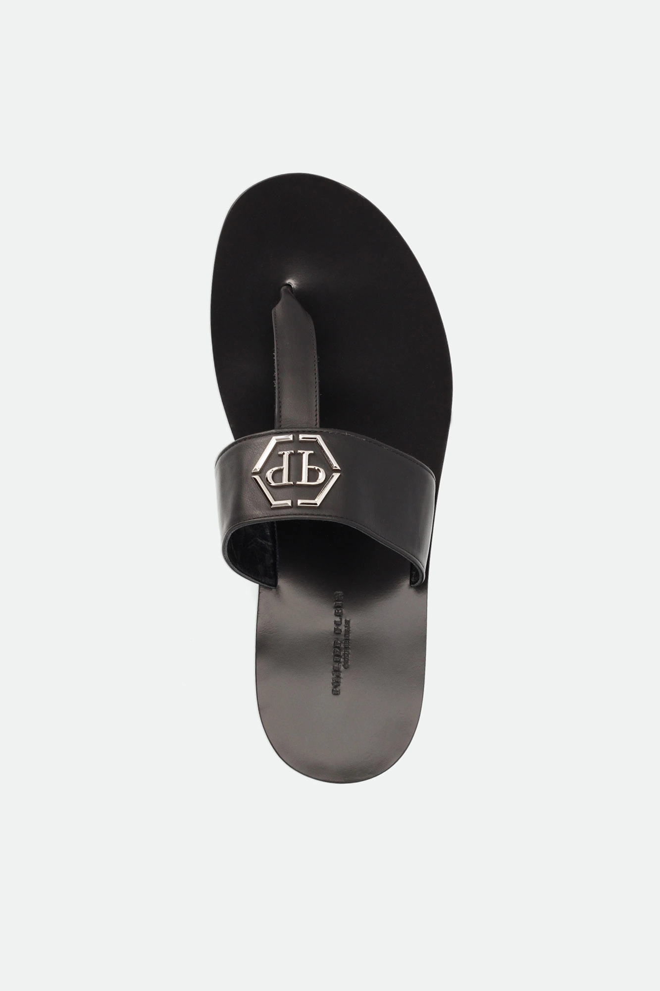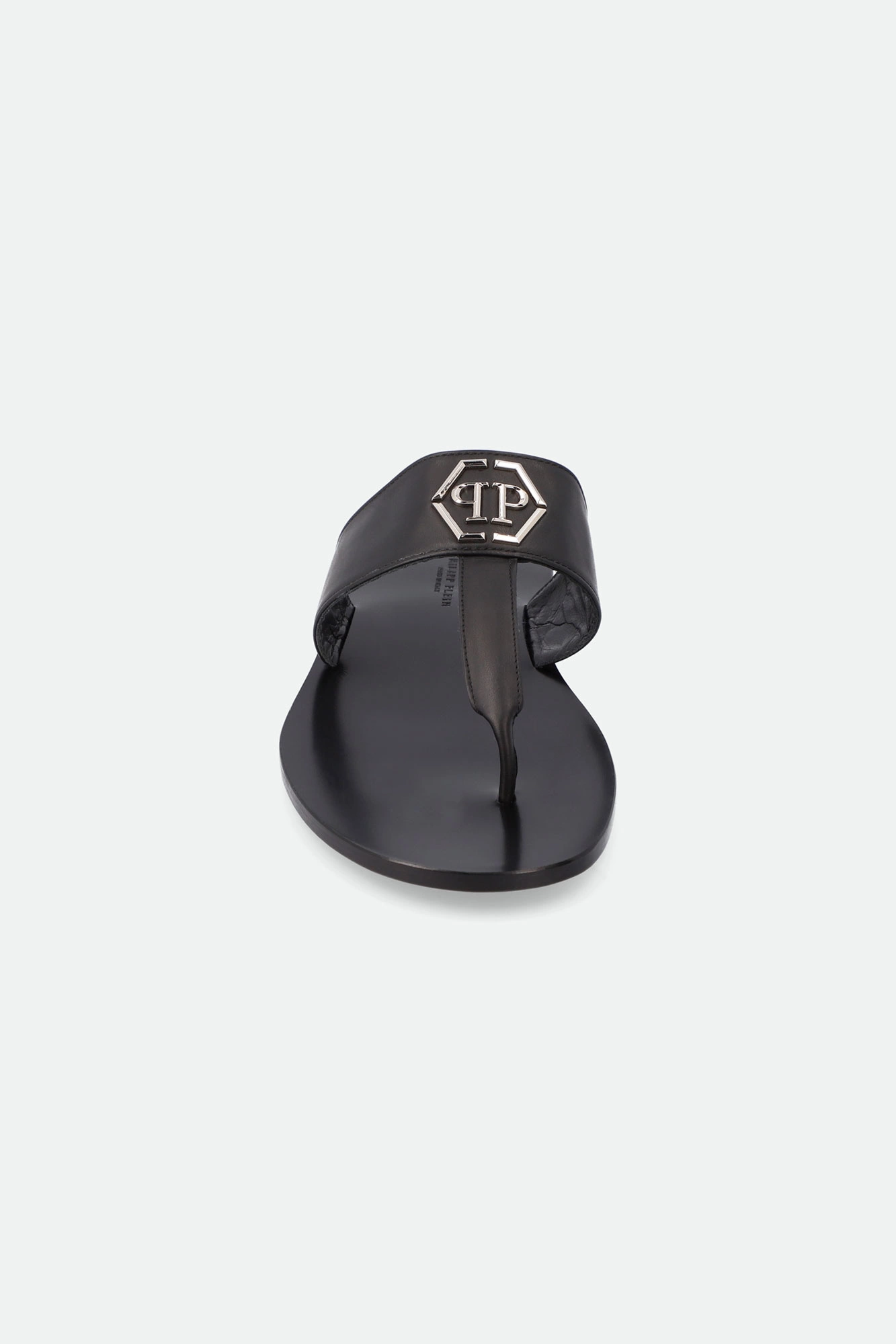 Japonki marki Philipp Plein w czarnym kolorze. Paski w kształcie litery T. Na pasku metalowa aplikacja z logo marki w srebrnym kolorze. Skórzana wkładka z tłoczoną nazwą marki. Wykonane z naturalnej skóry cielęce.