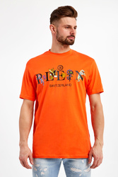 T-shirt marki Philipp Plein w pomarańczowym kolorze. Fason typu regular fit. Z przodu duży kolorowy nadruk z nazwą marki. Na linii karku skórzana aplikacja w czarnym kolorze z metalowym logo. Okrągły dekolt typu o-neck wykończony ściągaczem. Krótkie rękawy i dół zakończone przeszyciem. Wykonany z czystej bawełny.