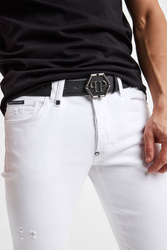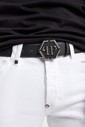 Skórzany pasek w czarnym kolorze marki Philipp Plein. Zapinany na klamrę z bolcem. Zdobiona metalowym logo marki. Na całości tłoczenia. Pasek wykonany z najwyższej jakości skóry naturalnej. W komplecie elegancki worek przeciwkurzowy we wzór logo marki.