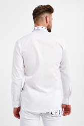 Koszula marki Philipp Plein w białym kolorze. Autorski dopasowany fason playboy cut. Zapinany za pomocą sygnowanych guzików. Klasyczny kołnierz z ozdobnym lampasem i nadrukiem z czaszkami w czarnym kolorze. Na piersi metalowa aplikacja z tłoczoną nazwą marki. Długie rękawy wykończone mankietami zapinanymi za pomocą guzików. Wykonana z czystej bawełny.