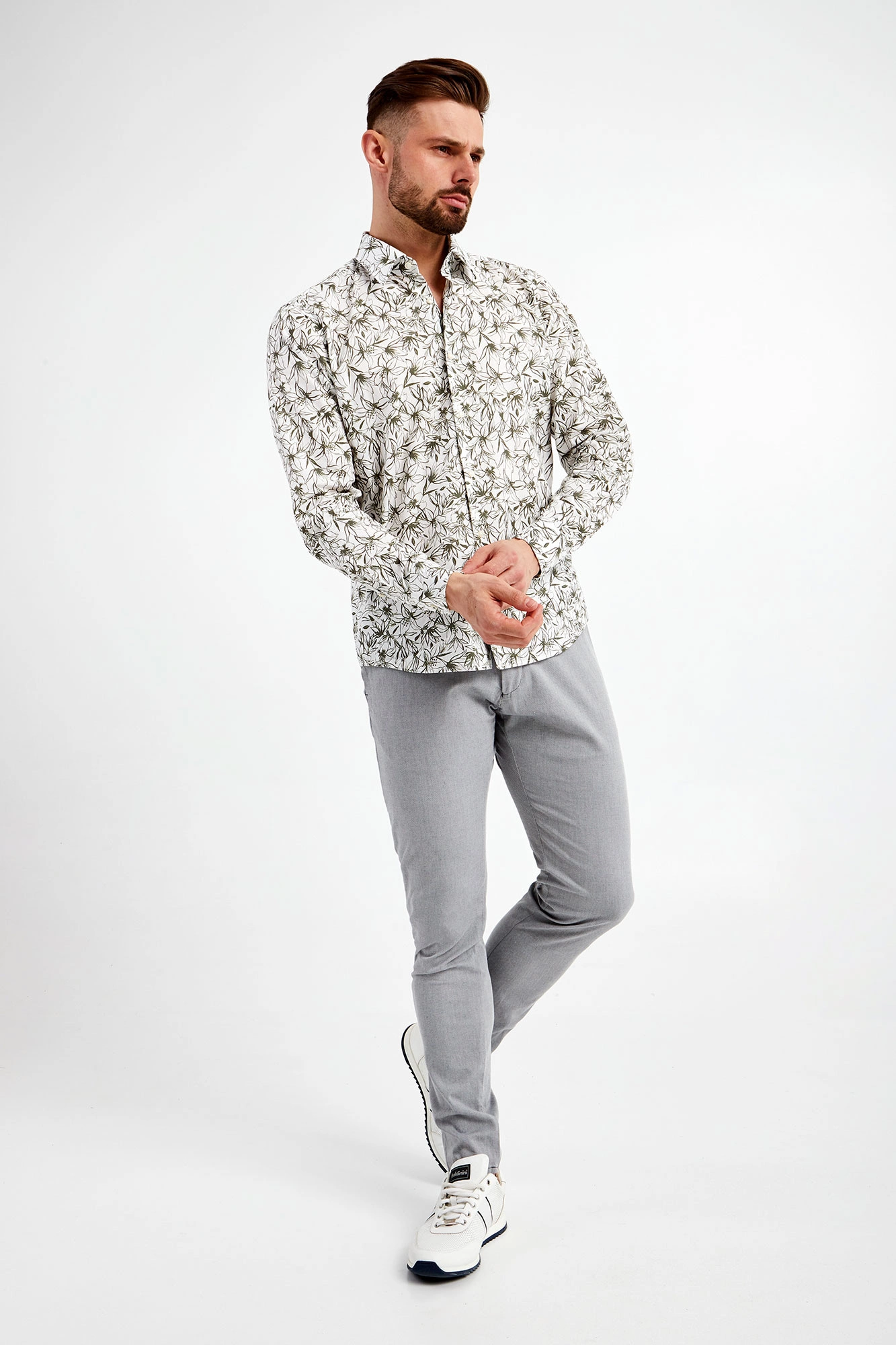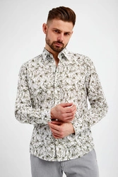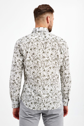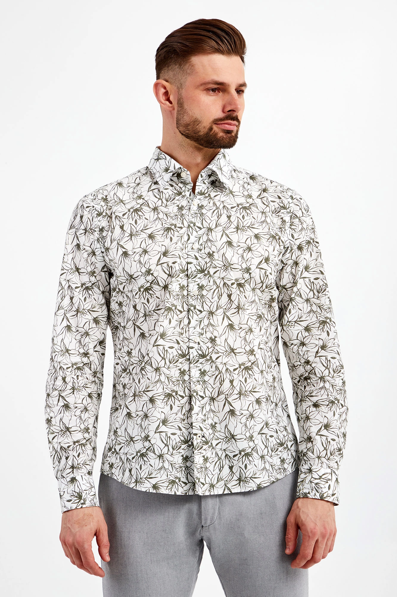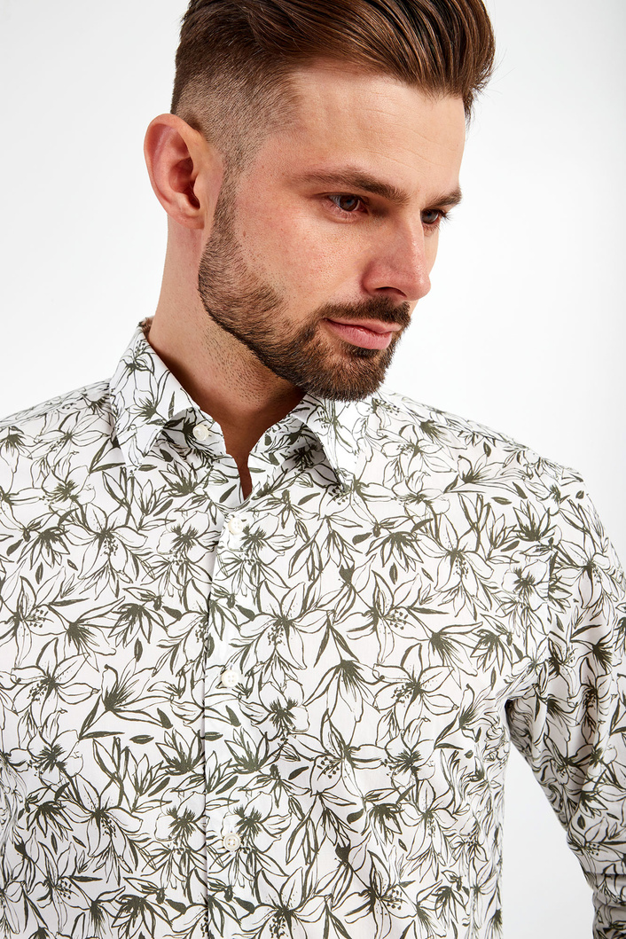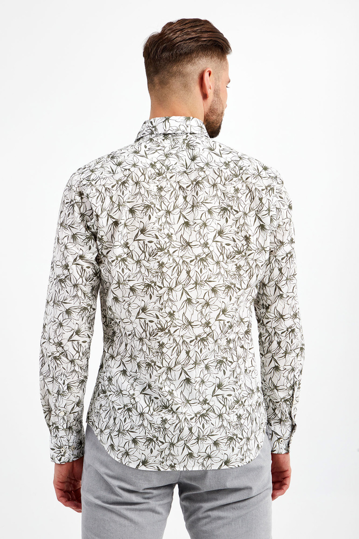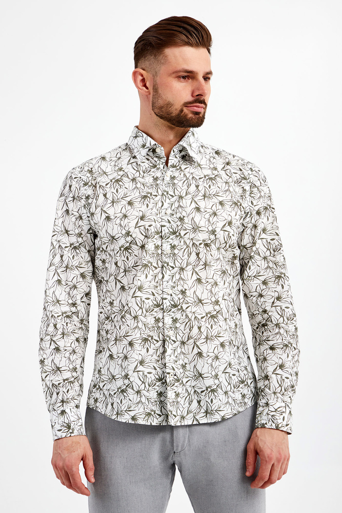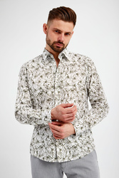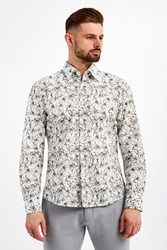 Koszula marki Joop! w białym kolorze. Na ciemnozielony wzór z motywem kwiatów. Zapinana za pomocą opalizujących guzików. Klasyczny kołnierzyk. Rękawy zakończone zapinanymi na guziki mankietami. Na plecach przeszycie. Wykonana ze stuprocentowej, przyjemnej w dotyku bawełny.