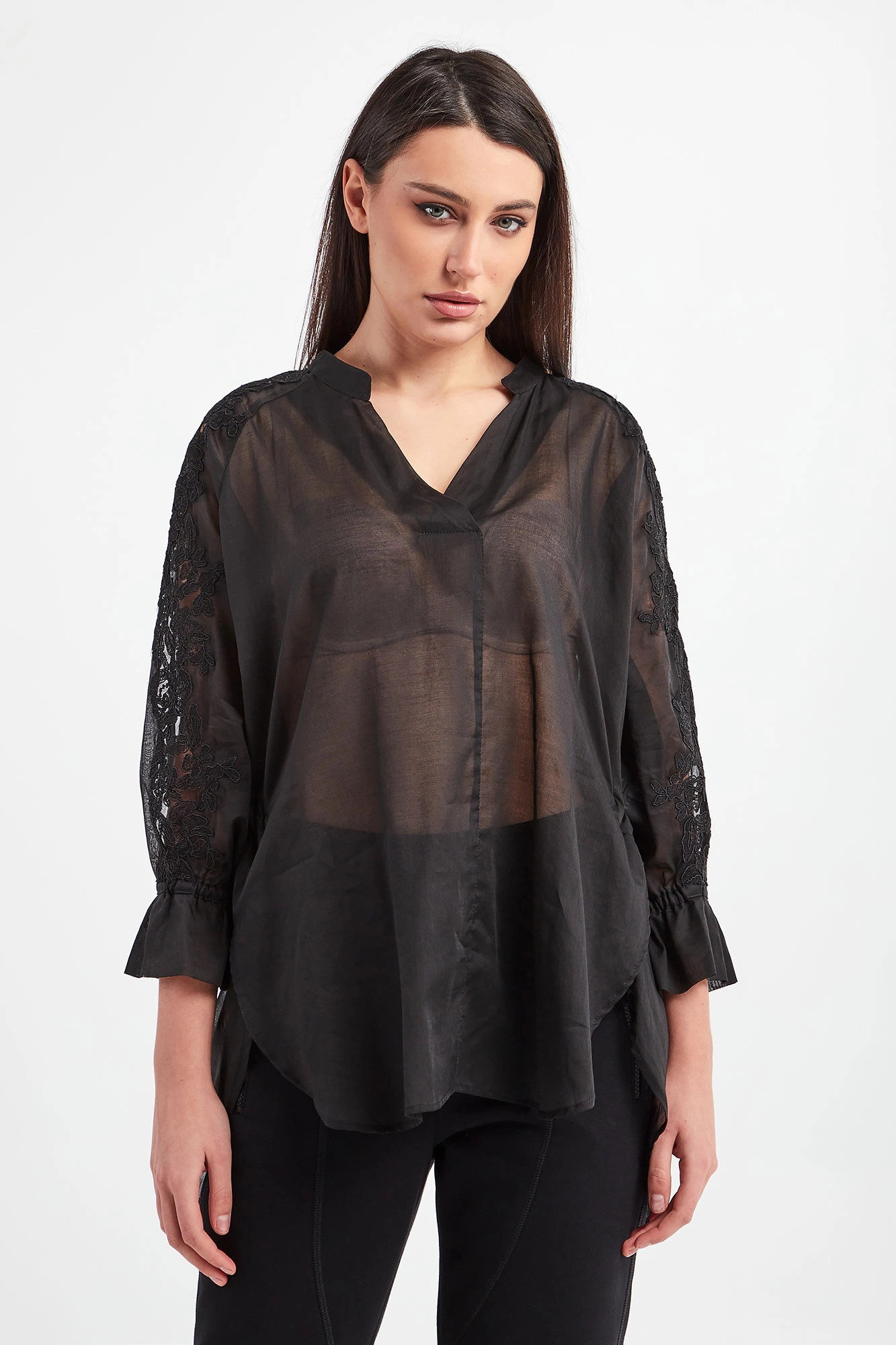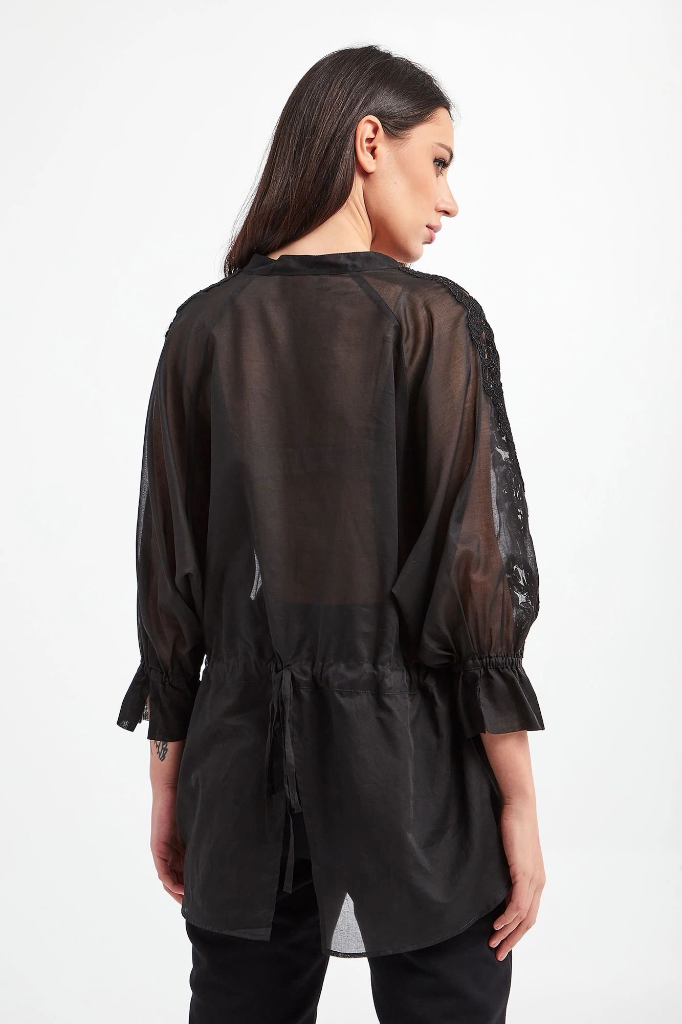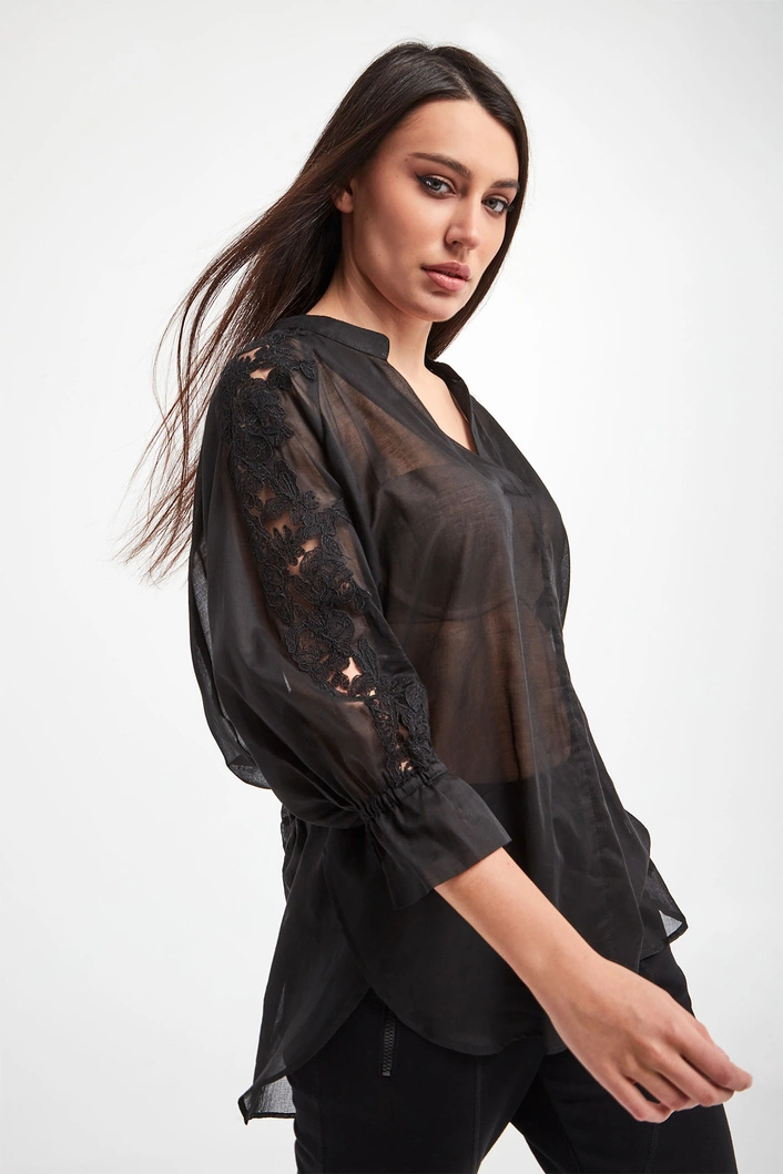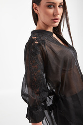 Koszula marki Ermanno Firenze w czarnym kolorze. Wykonana z półprzezroczystej, bawełnianej tkaniny. Fason relaxed fit. Na rękawach o długości 3/4 wstawki z koronki o kwiecistym wzorze oraz ściągacze. Dekolt typu v-neck. Na plecach ściągacz regulowany za pomocą troczków. Asymetryczny dół. Pionowe rozcięcie z tyłu. Delikatna oraz zwiewna.