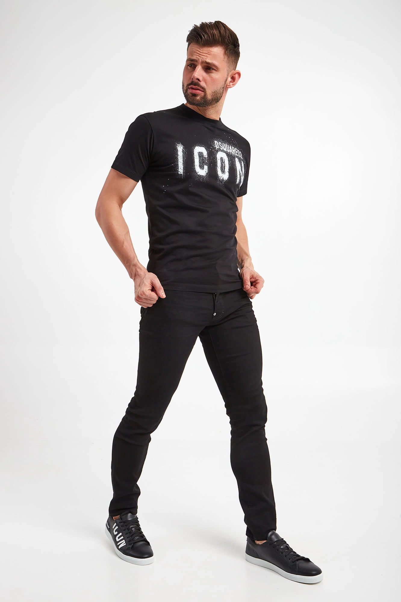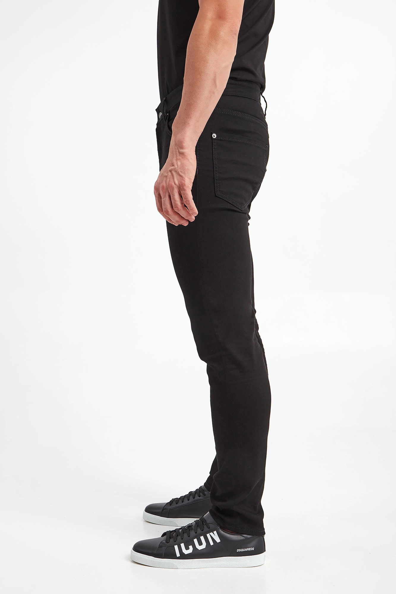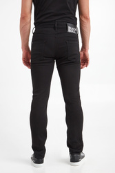 Jeansy marki Dsquared2 w czarnym kolorze. Dopasowany autorski fason cool guy jean. Zapinane za pomocą logowanych guzików. Model z pięcioma kieszeniami. W pasie szlufki. Z tyłu czarna, skórzana naszywka z wytłoczoną, białą nazwą marki. Nogawki wykończone lamówką. Wykonane z bawełny z domieszką elastanu.