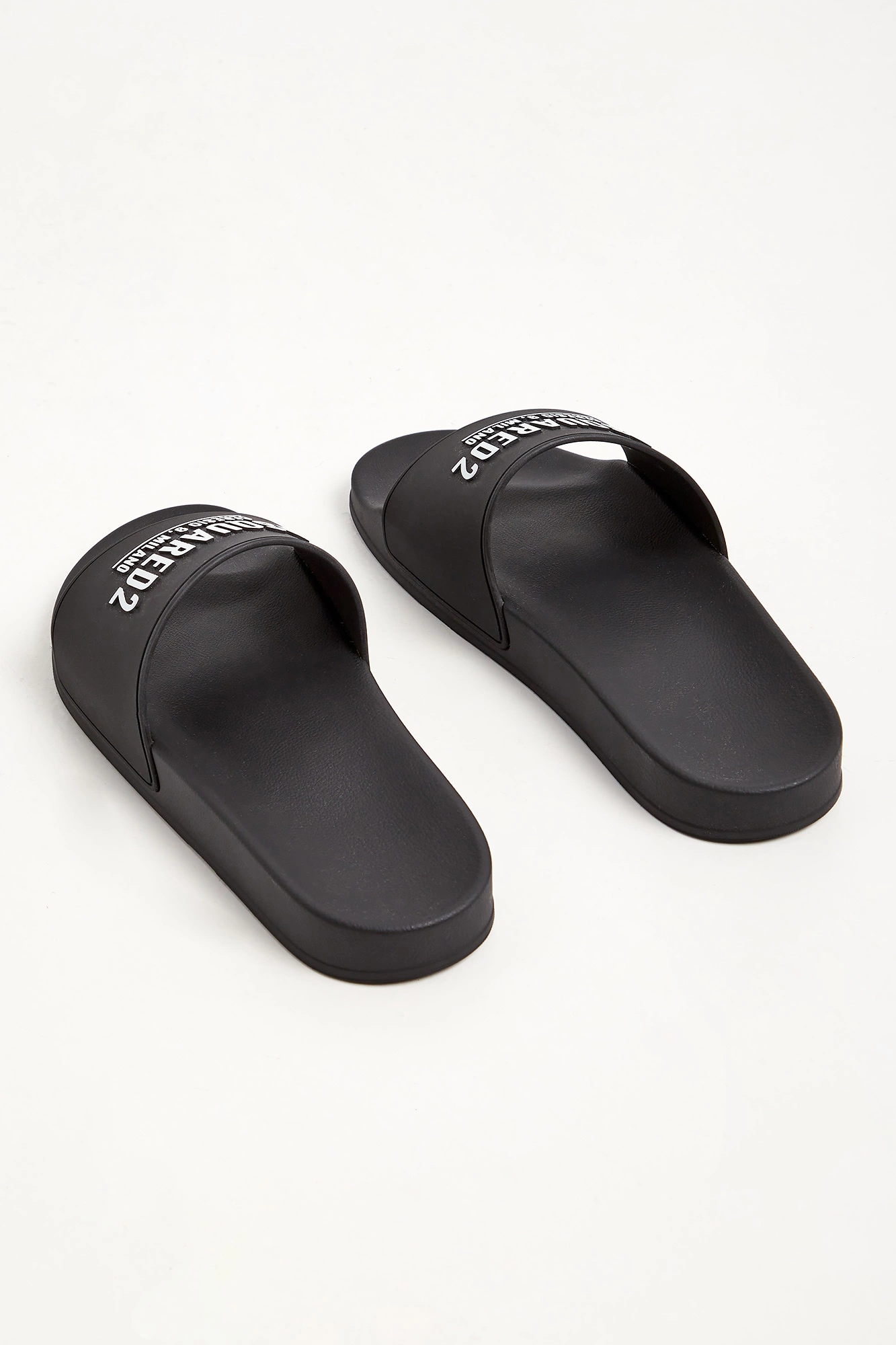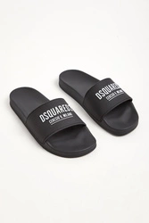 Klapki marki Dsquared2 w czarnym kolorze. Z przodu szeroki pasek z białymi, kontrastującymi, tłoczonymi napisami z nazwą marki. Podeszwa tłoczona oraz profilowana. Wykonane z lekkiego tworzywa.