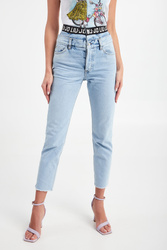 Błękitne jeansy marki Liu Jo. Fason typu slim. Wysoki stan. W pasie sygnowany ściągacz w kontrastowym, czarnym kolorze. Zapinane za pomocą zamka błyskawicznego i sygnowanych guzików. Model z pięcioma kieszeniami. Nogawki wykończone strzępieniem. Z tyłu metalowa aplikacja z tłoczoną nazwą marki i cyrkonią w srebrnym kolorze. Wykonane z czystej bawełny.