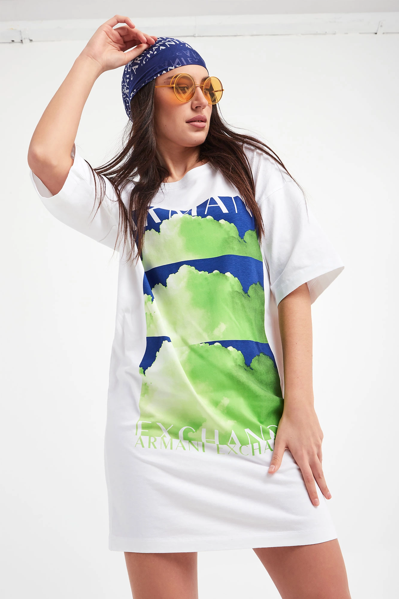 Chusta marki Armani Exchange w granatowym kolorze. Na całości białe, kontrastujące wzory z nazwą marki. Wykończona lamówką. Wykonana z gładkiej, półprzezroczystej tkaniny.