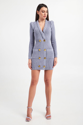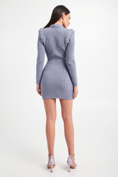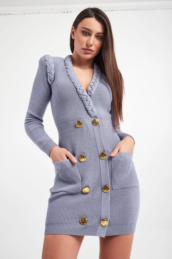 Elegancka sukienka w niebiesko-fioletowym kolorze. Fason typu slim fit. Długość mini. Dekolt typu v-neck. Przy dekolcie oraz na ramionach dekoracyjna plecionka. Na całości wpleciona srebrna, metalizowana nić. Z przodu dwie kieszenie. Rękawy dół oraz kieszenie wykończone ściągaczem. Zapinana za pomocą złotych, sygnowanych zatrzasków. Wykonana z prążkowanej dzianiny.
