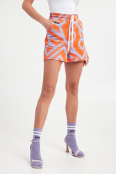 Spodenki marki Ice Play. Na całości wzór w kolorze pomarańczowo-liliowym. Fason relaxed fit. Pas elastyczny, regulowany za pomocą logowanych troczków w białym kolorze. Z przodu dwie kieszenie. Spodenki w całości wykonane z bawełny.