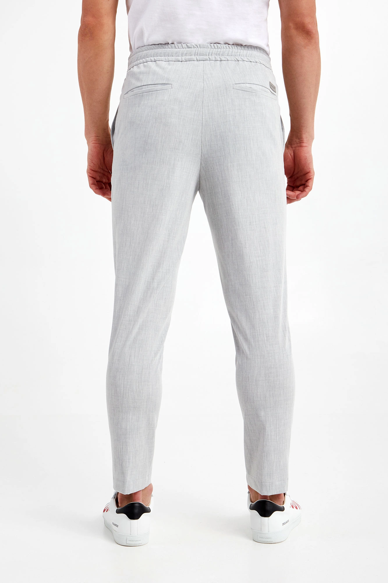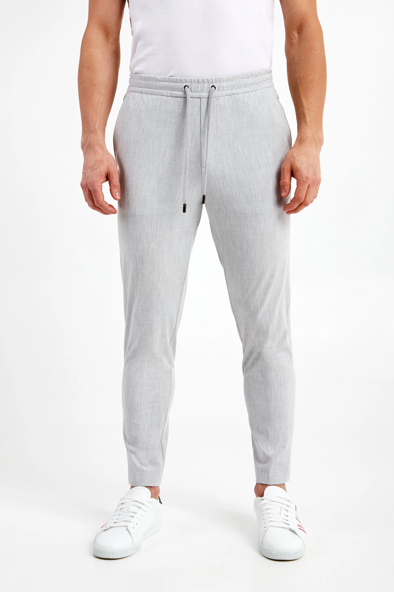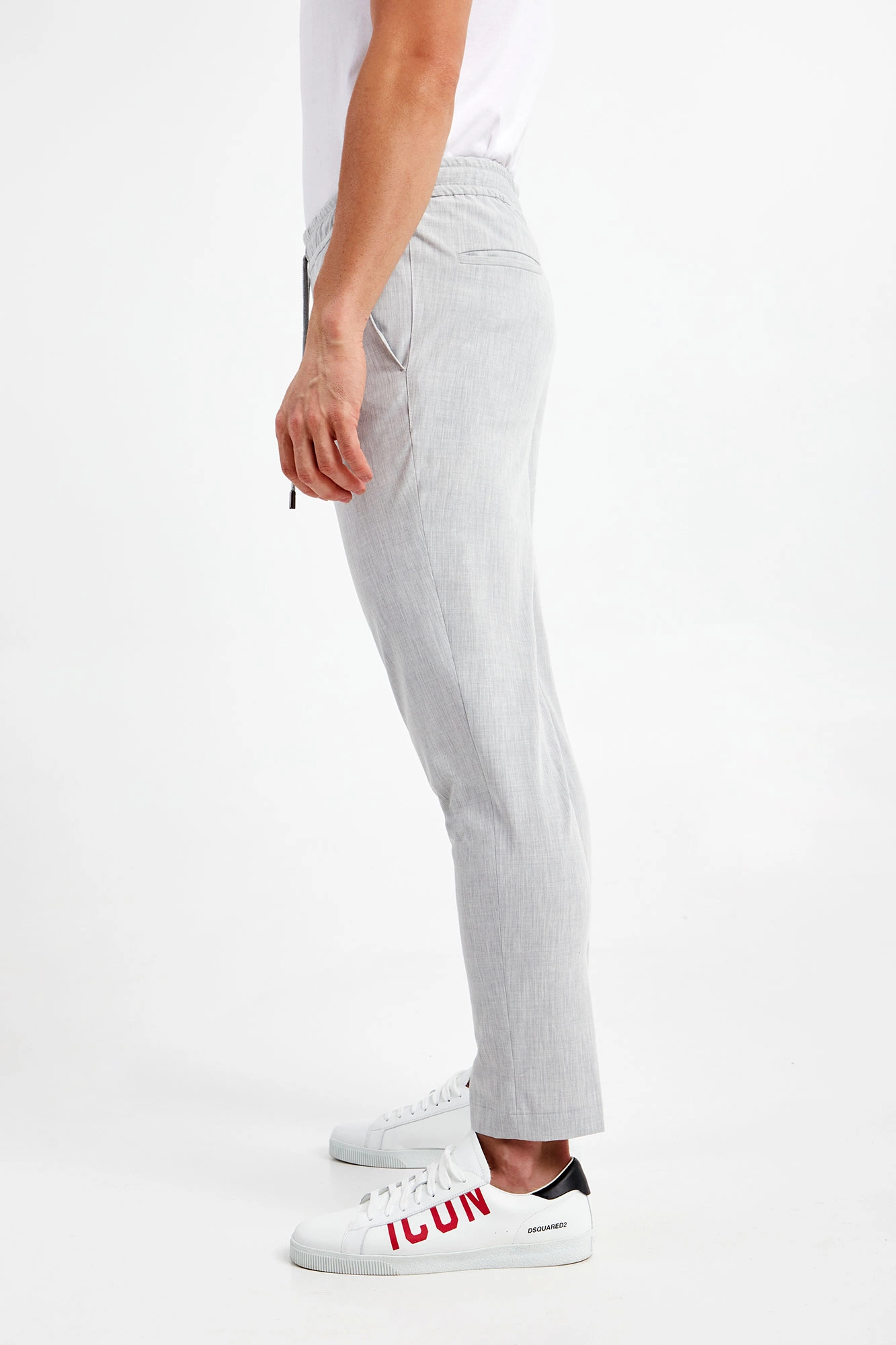 Spodnie marki Joop! w kolorze szarego melanżu. Fason regular fit. W talii elastyczny ściągacz regulowany za pomocą troczków. Model z czterema kieszeniami. Z tyłu gumowana naszywka z nazwą marki. Wykonane z elastycznej wiskozy.