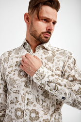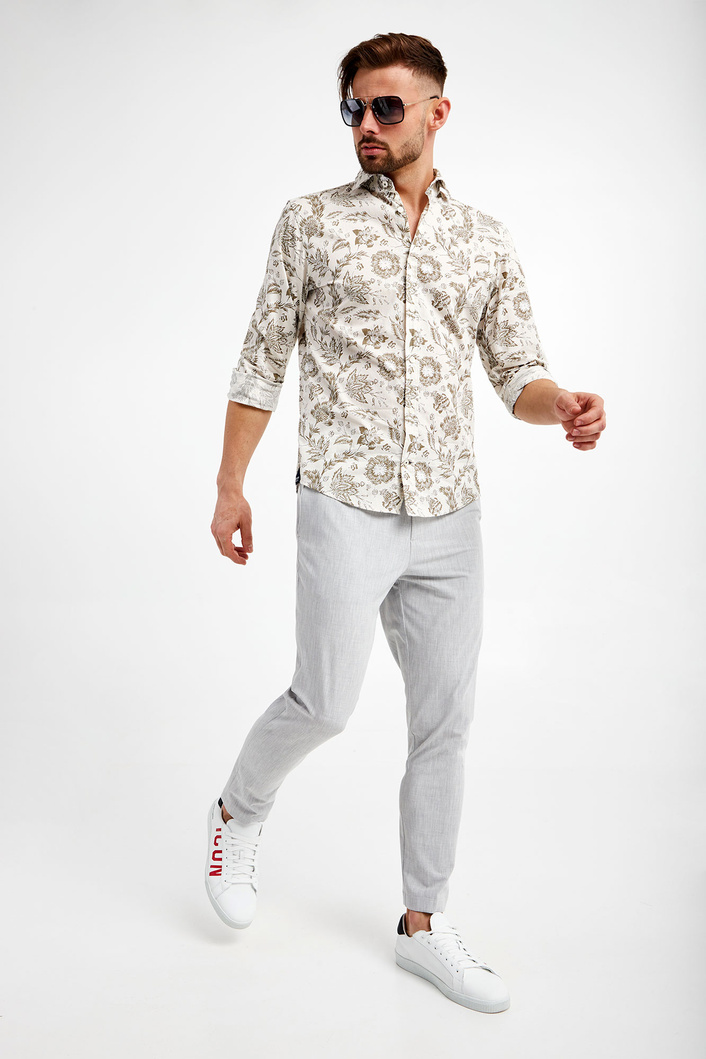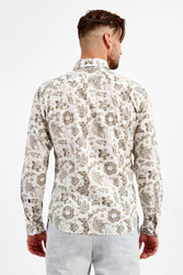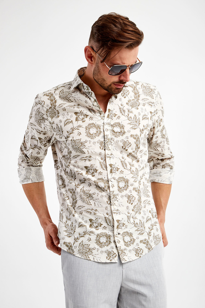 Koszula marki Joop! Jeans w kolorze ecru. Na całości zielono-biały wzór z roślinnym motywem. Fason slim fit. Zapinana za pomocą sygnowanych guzików. Klasyczny kołnierzyk. Rękawy zakończone zapinanymi na guziki mankietami. Po bokach i na rękawie logowane naszywki w granatowym kolorze. Wykonana z czystej bawełny.
