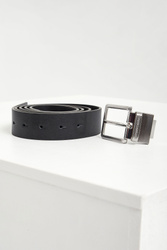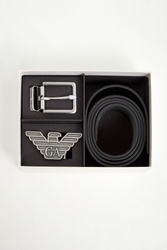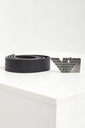 Pasek marki Emporio Armani w czarnym kolorze. Zapinany za pomocą dwóch, wymiennych klamr. Jedna duża, metalowa w kształcie logo marki w srebrnym kolorze, druga klasyczna. Wykonany z gładkiej naturalnej skóry.