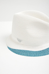Kapelusz marki Emporio Armani w białym kolorze. Z przodu turkusowa wstawka. Z boku biała, metalowa zawieszka w kształcie logo. Na całości pleciony.