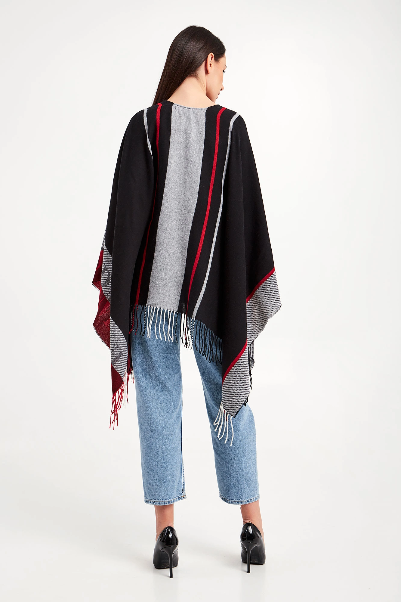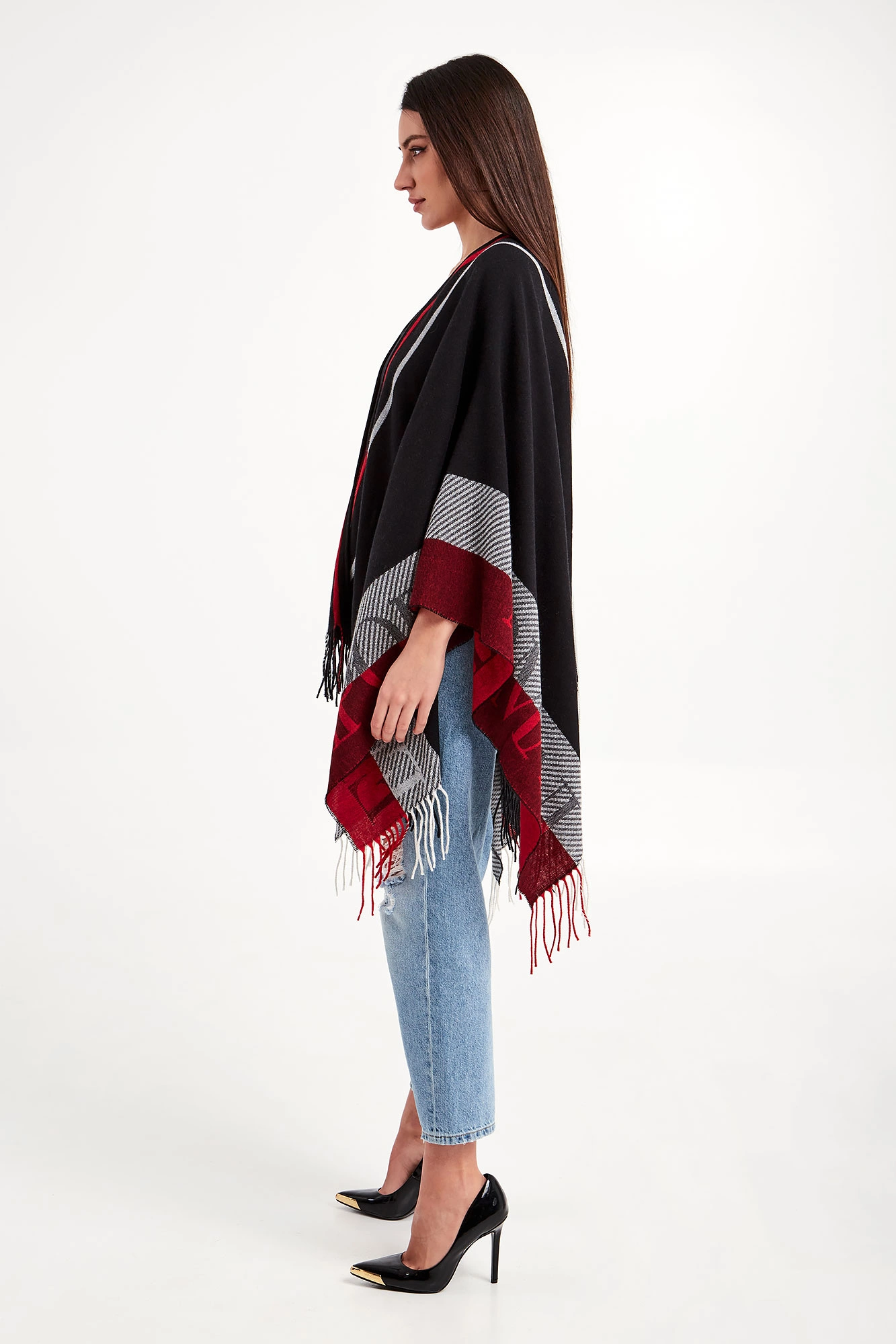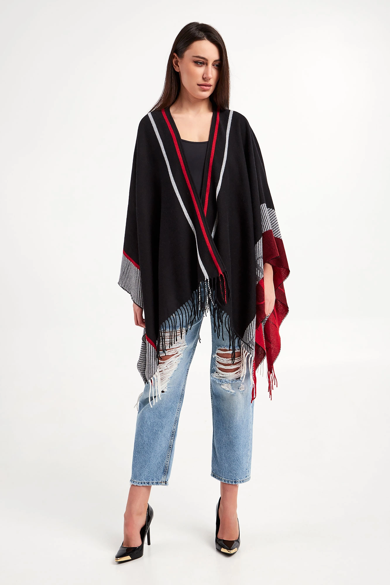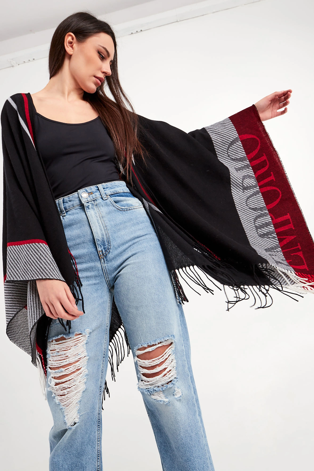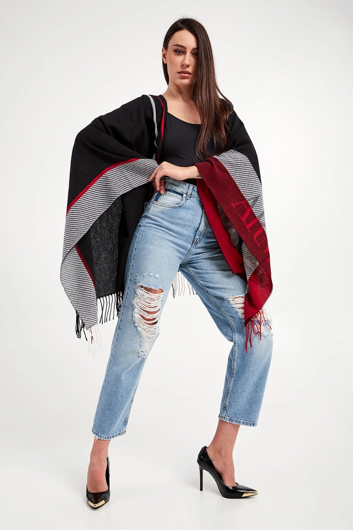 Szal marki Emporio Armani w czarnym kolorze. Na całości szare i czerwone paski. Wykończony frędzlami. Wykonany z mieszanki wełny i bawełny.