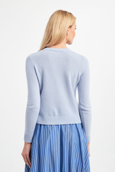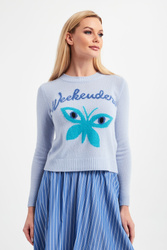 Sweter marki Weekend Max Mara w błękitnym kolorze. Fason slim fit. Z przodu niebieski napis oraz turkusowy motyw motyla nawiązujący do logo marki. Dekolt typu o-neck, długie, przylegające rękawy i dół zakończone elastycznymi ściągaczami. Przy rękawach ozdobne przeszycia. Wykonany z czystego, bardzo miękkiego kaszmiru.