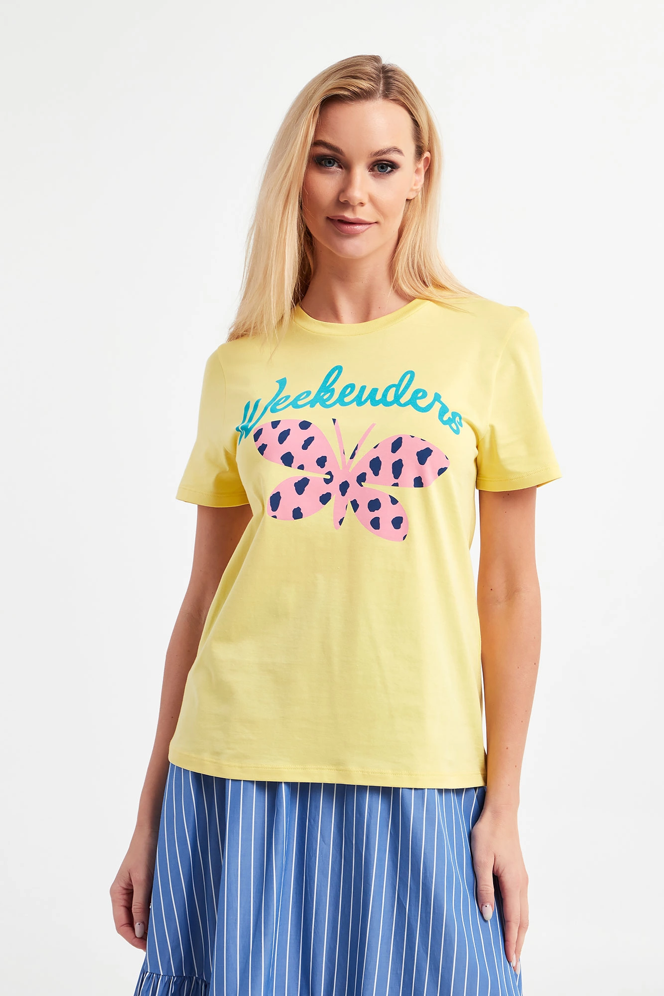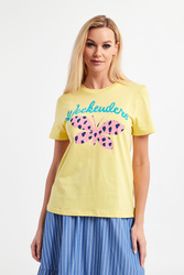 T-shirt marki Weekend Max Mara w żółtym kolorze. Fason regular fit. Z przodu wielokolorowy nadruk. Z tyłu na linii karku czarny nadruk w postaci logo marki. Dekolt typu o-neck zakończony elastycznym ściągaczem. Wykonany z tkaniny bawełnianej. Krótkie, proste rękawki oraz dół wykończone lamówką.