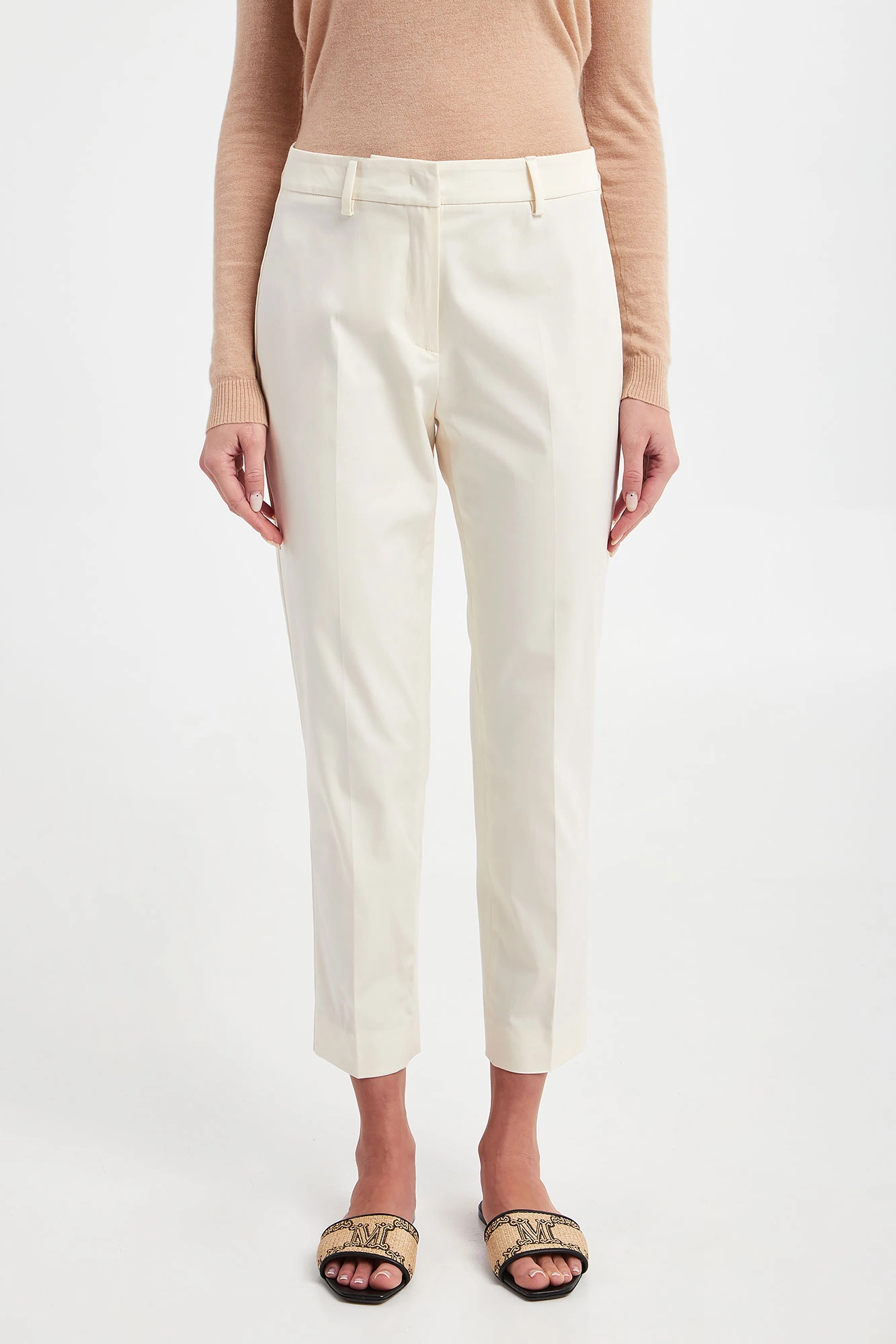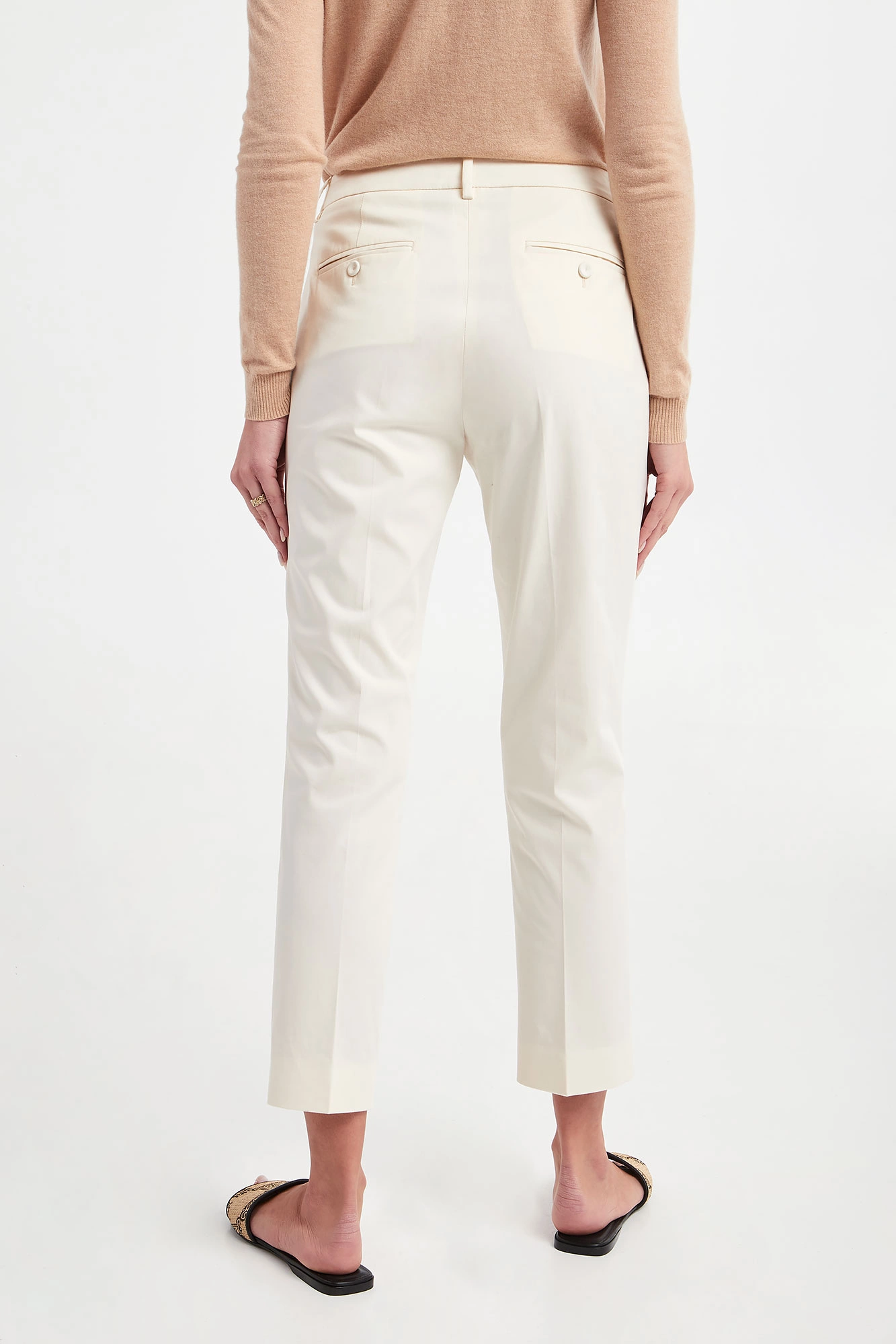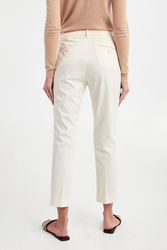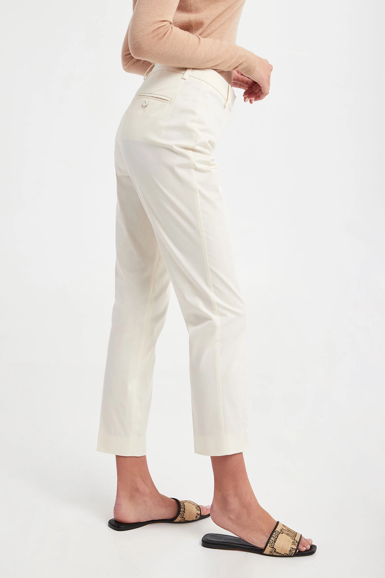 Spodnie marki Weekend Max Mara. Cygaretki w kolorze ecru z kantem na nogawce. Zapinane za pomocą zamka oraz zapięcia na haftkę. W pasie szlufki. Dwie tylne, zapinane na małe guziki, kieszenie. Wykonane z elastycznej, bawełnianej gabardyny. Ich kolor nada każdej stylizacji letniej lekkości, a klasyczny krój kobiecości, elegancji i ponadczasowości.