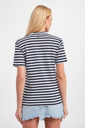 T-shirt marki Joop! w biało-granatowe paski. Fason regular fit. Dekolt typu o-neck zakończony ściągaczem. Z przodu haft w postaci logo w granatowym kolorze. Krótkie rękawy oraz dół wykończone lamówką. Z tyłu, na linii karku złota, sygnowana zawieszka. Wykonany ze stuprocentowej bawełny.