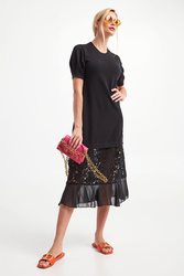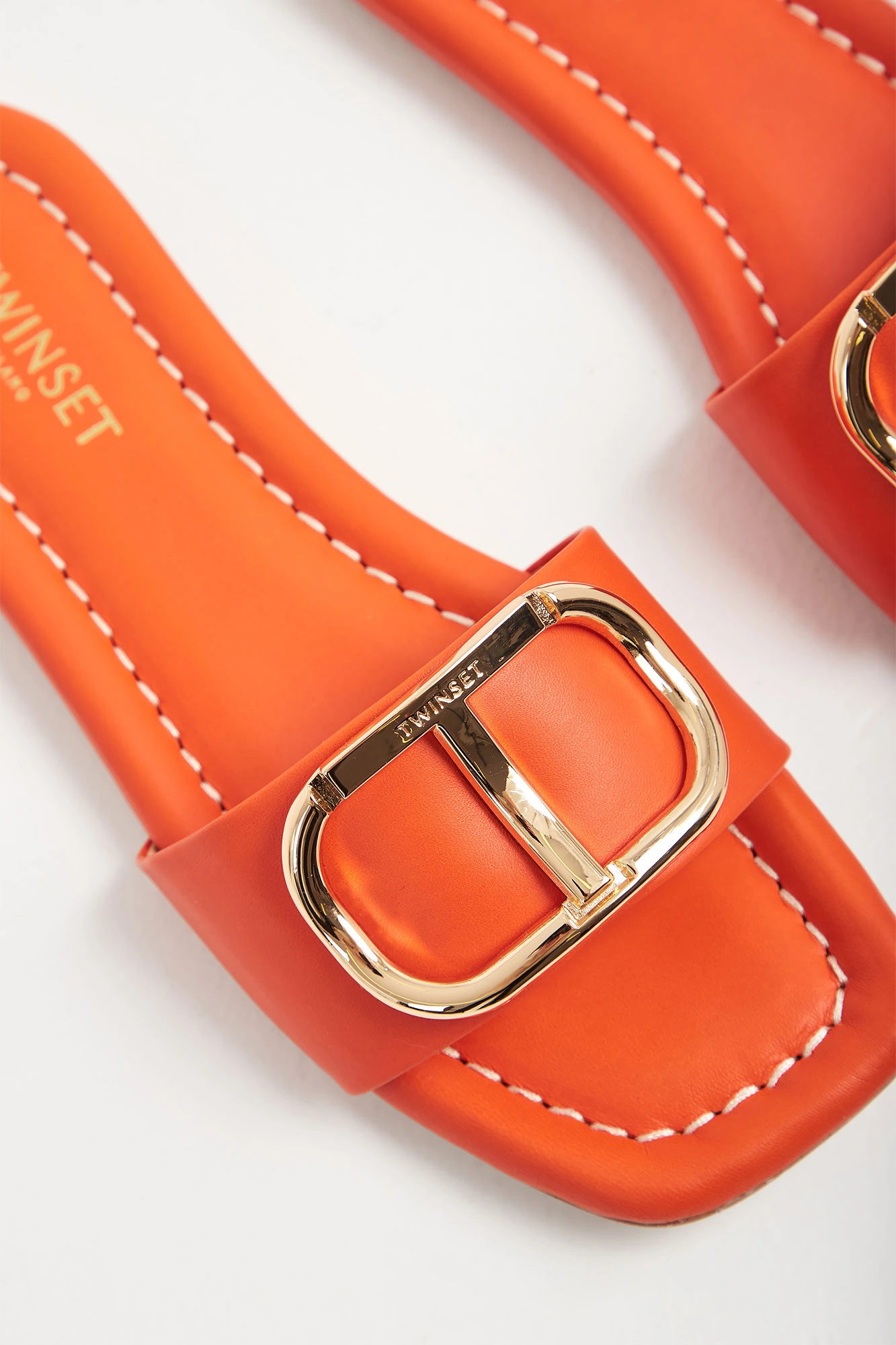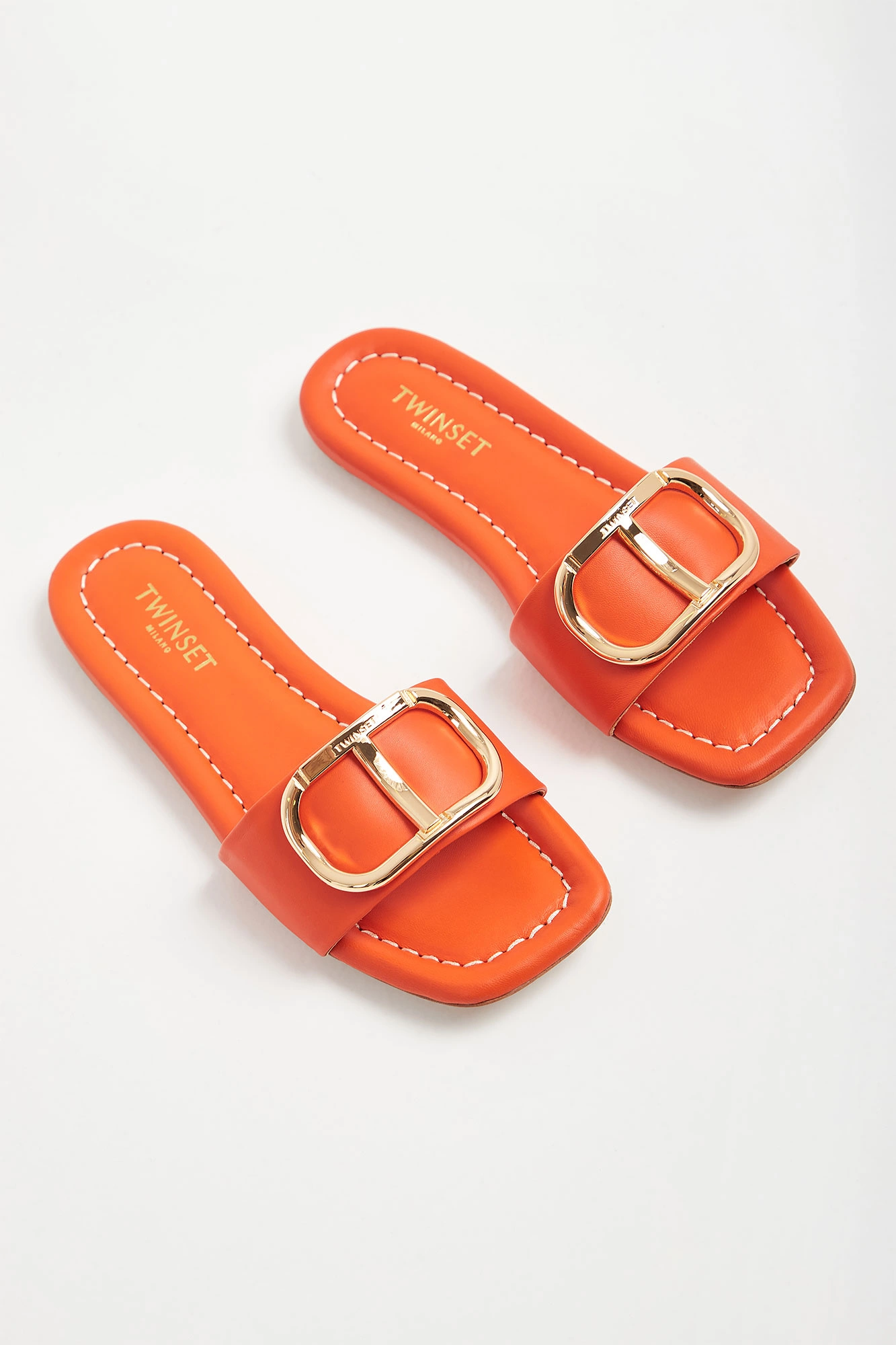 Klapki marki Twinset w pomarańczowym kolorze. Sygnowana wyściółka z ozdobnymi przeszyciami w kontrastowym, białym kolorze. Z przodu pasek z metalową aplikacją w kształcie logo marki z tłoczoną nazwą marki. Wykonane z naturalnej skóry.