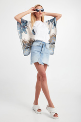 Spódnica marki Liu Jo w jasnoniebieskim kolorze. Fason typu slim. Długość mini. Zapinana za pomocą sygnowanych guzików w srebrnym kolorze. Model z czterema kieszeniami. Przednie kieszenie wykończone ozdobionymi cyrkoniami i dżetami. Dół zakończony ozdobnym strzępieniem. Wykonana z bawełny i lyocellu.