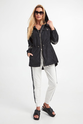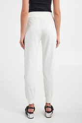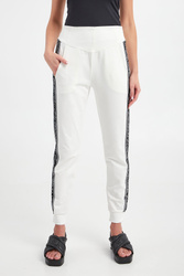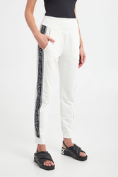 Spodnie dresowe marki Liu Jo Sport w kolorze złamanej bieli. Fason typu jogger. Po bokach nogawek lampasy ze wzorem w czarno-białym kolorze z logo marki. Z boku kryty zamek. Dwie boczne kieszenie. Nogawki zakończone ściągaczami. Wykonane z miękkiego i miłego w dotyku materiału.