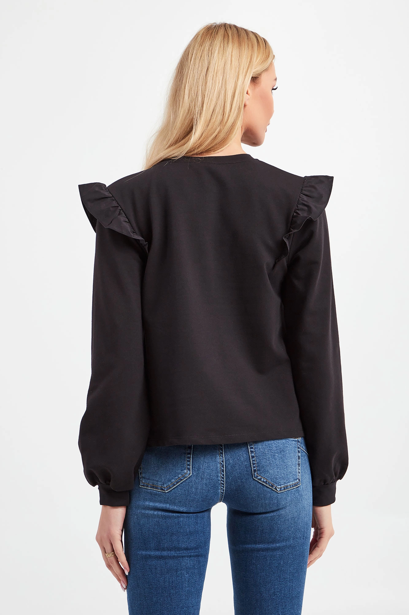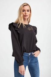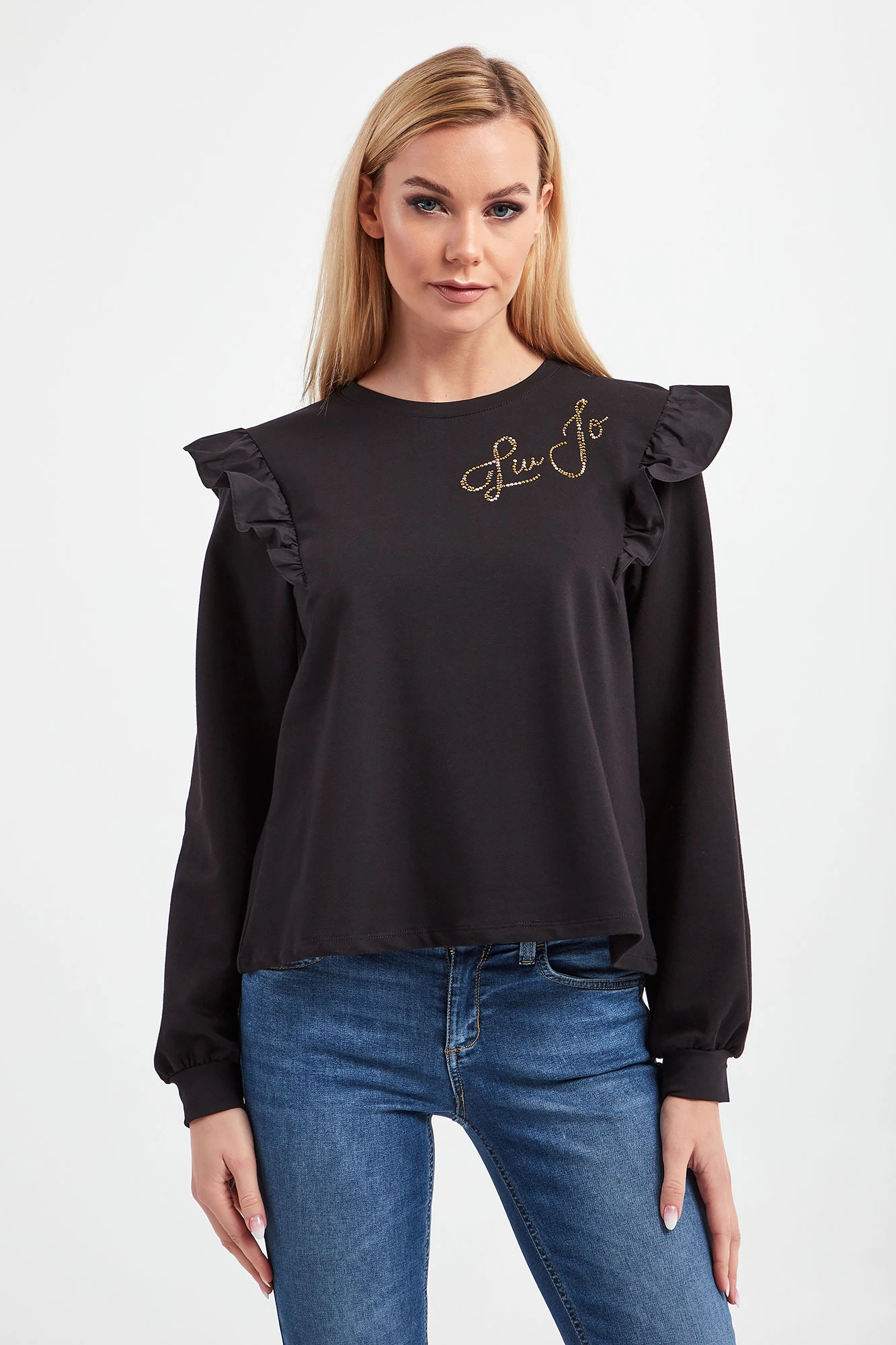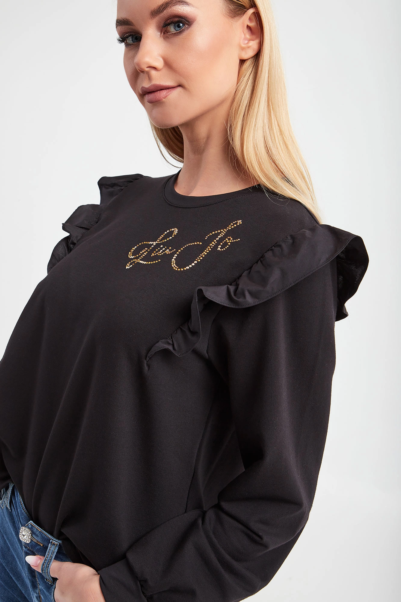 Bluza marki Liu Jo w czarnym kolorze. Fason regular fit. Dekolt typu o-neck i długie rękawy wykończone elastycznym ściągaczem. Linia ramion zakończona ozdobnymi falbanami. Z przodu nazwa marki wykonana ze złotych cyrkonii. Wykonana z elastycznej bawełny.